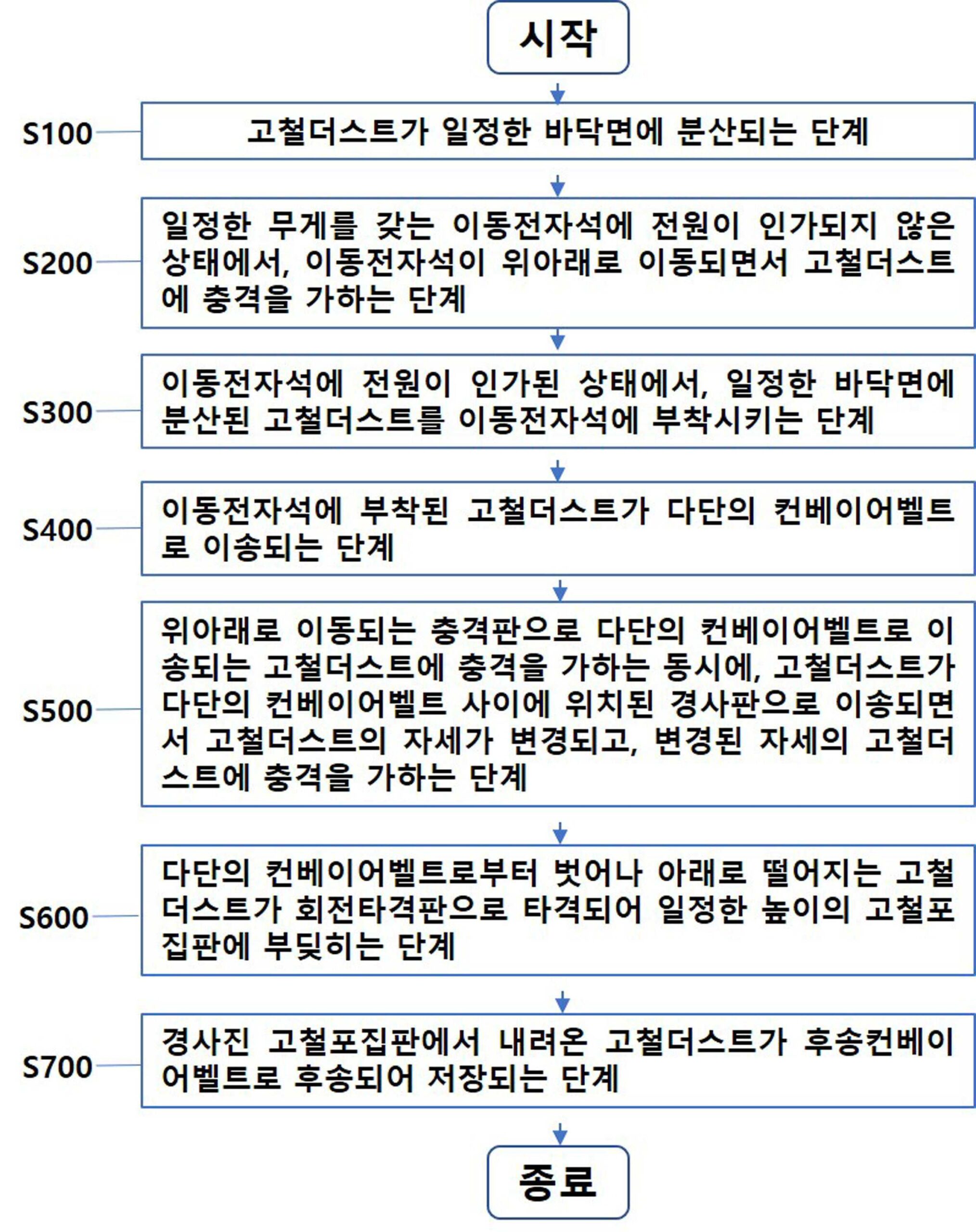 요약 : 본 발명은 고철더스트에서 부착된 이물질을 분리하는 방법으로서, (a) 고철더스트(D)가 일정한 바닥면에 분산된 상태에서, 일정한 무게를 갖는 이동전자석이 상기 일정한 바닥면의 위에 위치되어 상기 고철더스트(D)가 상기 이동전자석에 부착되는 단계; (b) 상기 고철더스트(D)가 다단의 컨베이어벨트(300)에 놓여진 상태로 이송되면서, 상기 다단의 컨베이어벨트의 위에서 위치된 충격판(200)이 실린더의 작동에 의해 위에서 아래로 이동되어, 상기 다단의 컨베이어벨트로 이송되는 상기 고철더스트(D)에 충격을 가하는 단계; 및 (c) 상기 다단의 컨베이어벨트로부터 벗어나 아래 방향으로 떨어지는 상기 고철더스트(D)가 회전타격판에 의해 타격되어, 상기 회전타격판(440)으로부터 일정한 거리에 위치되어 일정한 높이로 형성된 메쉬 형태의 고철포집판에 부딪히는 단계를 포함하는 고철더스트에서 부착된 이물질을 분리하는 방법에 관한 것이다.