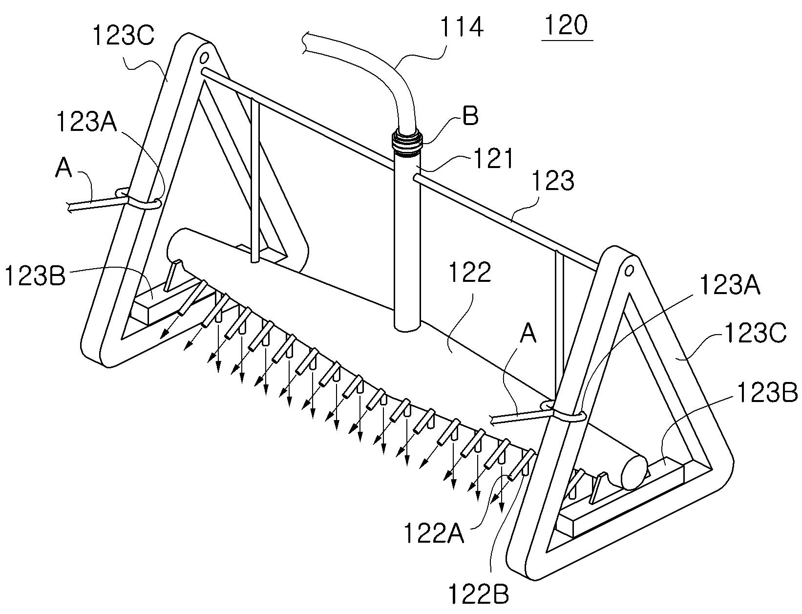 요약 :본 발명의 실시 예에 따른 수중 퇴적물 정화장치는 선박에 구비되고, 저질 개선제와 혼합한 해수를 공급하는 펌프부; 및 상기 선박의 진행방향으로 견인되고, 상기 펌프부가 공급한 해수를 해저 바닥에 상기 선박의 진행방향으로 경사지게 분사하는 제1 노즐과 상기 제1 노즐의 후방에 형성되고, 상기 바닥의 수직방향으로 상기 해수를 분사하는 제2 노즐을 구비한 분사부; 를 포함하되, 상기 분사부는 상기 펌프부로부터 해수가 저질 개선제와 혼합한 해수를 공급받는 적어도 하나의 공급관; 다수의 상기 제1 노즐과 다수의 상기 제2 노즐이 형성된 원통형의 고압수 분배관; 및 상기 공급관과 상기 고압수 분배관을 지지하도록 프레임 구조로 형성되고, 상기 고압수 분배관의 양단이 연결되는 바디 프레임; 을 포함하며, 상기 고압수 분배관은 상기 제1 노즐과 상기 제2 노즐에서 분사하는 해수의 압력 차를 발생시키는 수압조절수단; 을 포함하고, 상기 수압조절수단은 다수의 홀이 구비된 격벽 형상으로서, 상기 고압수 분배관의 내부에 구비되고, 상기 제1 노즐과 상기 제2 노즐에 공급되는 해수에 압력차를 발생시키기 위해 상기 고압수 분배관의 내부를 서로 다른 체적으로 분할한다.