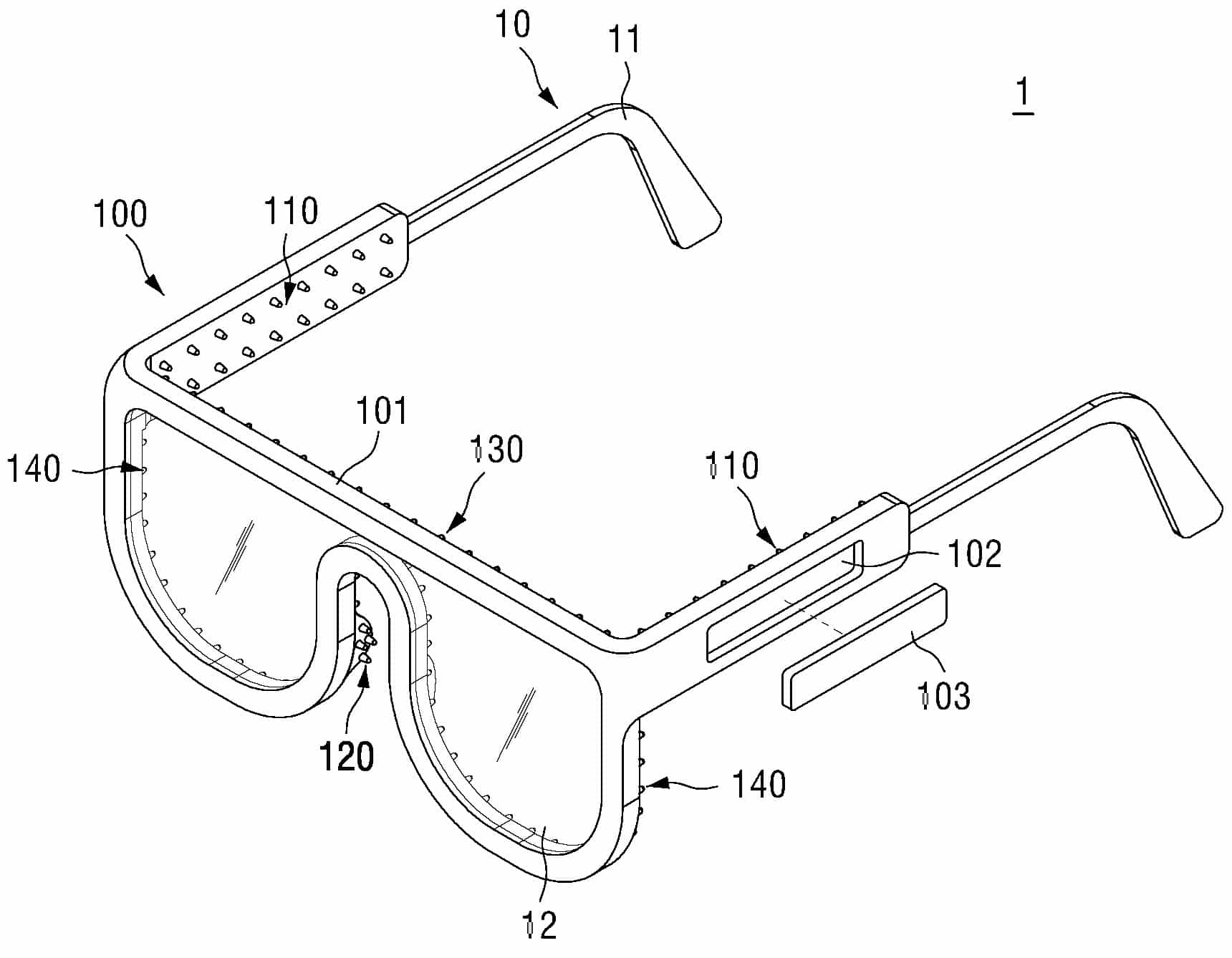 요약 : 본 발명의 일 실시예에 따른 골전도 이어폰이 구비 가능한 경혈지압 안경 커버는 안경 다리, 코받침, 림으로부터 탈부착되는 안경 커버 본체; 안경 커버 본체의 홈을 통해 안경 커버 본체의 내부에 삽입되며, 골전도를 통해 소리를 전달하는 진동자; 진동자와 연결되며, 진동자의 진동 세기와 진동자의 동작 여부를 감지하는 진동감지센서; 및 동작감지센서; 안경 다리의 일부를 감싸는 안경 커버 본체의 일부의 내측에 구비되되 진동자와 연결되며, 진동자의 진동 세기에 따라 조절 가능한 제1 진동에너지를 생성하고, 제1 진동에너지에 의한 제1 진동 세기로 제1 경혈점을 지압하는 제1 경혈 지압부; 코받침을 감싸는 안경 커버 본체의 일측에 구비되되 제2 진동에너지를 생성하며, 제2 진동에너지에 의한 제2 진동 세기로 제2 경혈점을 지압하는 제2 경혈 지압부; 림을 감싸기 위해 휘어진 형태인 안경 본체 커버의 타측의 하부에 구비되되 제3 진동에너지를 생성하며, 제3 진동에너지에 의한 제3 진동 세기로 제3 경혈점을 지압하는 제3 경혈 지압부; 및 림을 감싸기 위해 일 방향으로 연장형성된 안경 본체 커버의 타측의 상부에 구비되되 제4 진동에너지를 생성하며, 제4 진동에너지에 의한 제4 진동 세기로 제4 경혈점을 지압하는 제4 경혈 지압부;를 포함하고, 제1 경혈점은 이문혈, 청궁혈, 청회혈 중 적어도 하나, 제2 경혈점은 정명혈, 제3 경혈점은 승읍혈, 사백혈, 동자료혈, 태양혈 중 적어도 하나, 제4 경혈점은 사죽공혈, 찬죽혈 중 적어도 하나이다.