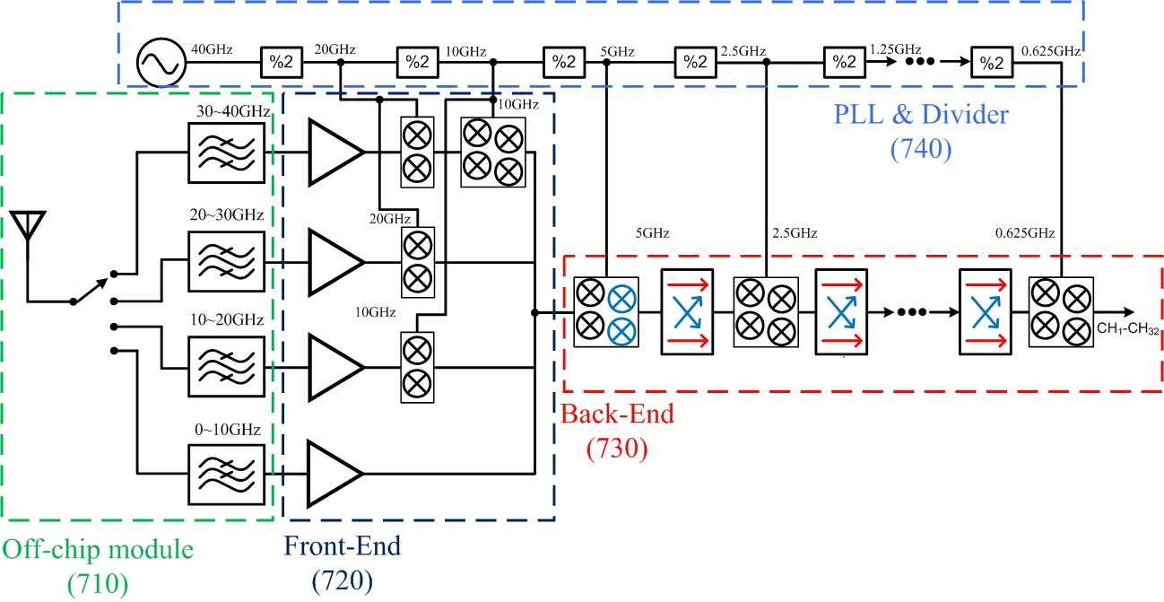 화를 적용하고, 채널에 따른 상향/하향 주파수 변환을 통해 광대역 수신을 실현하며, 주파수 합성기의 주파수 변