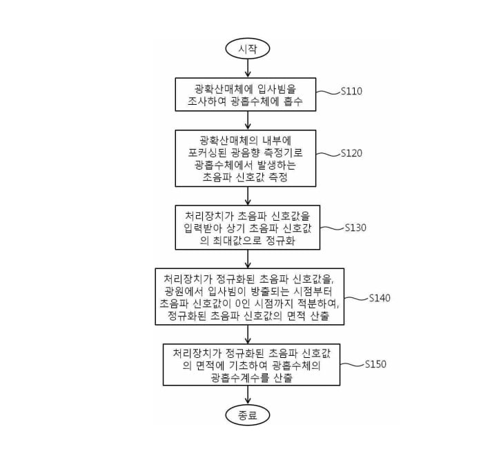 호값의 면적을 산출하는 단계; 및 상기 처리장치가 상기 정규화된 초음파 신호값의 면적에 기초하여 상기 광흡수