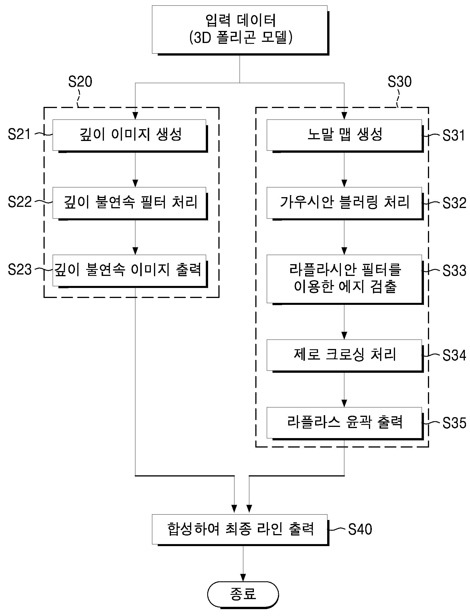 본 발명은 3D 폴리곤 모델의 표면에서 에지를 검출하여 특징선을 추출하는 오브젝트 공간에서의 접근법과, 3D 폴리곤 모델이나 2D 이미지의 화면을 캡쳐하여 깊이 정보에 의한 특징선을 추출하는 이미지 공간에서의 접근법을 모두 이용하여 선명한 라인을 추출함으로써 모델의 입력 데이터에 대한 양과는 관계없이 일정한 처리 시간을 제공하여 모델의 복잡성과는 무관하게 빠른 처리 시간을 제공하는 3D 모델의 라인 드로잉 방법 및 이를 이용한 프로그램이 기록된 컴퓨터 판독가능 기록매체를 제공한다.