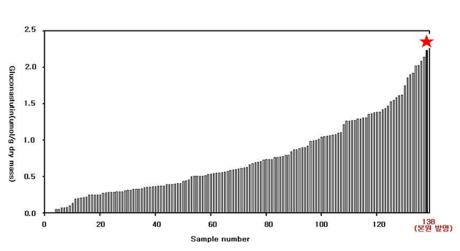 요약 : 본 발명은 KACC98014P, KACC98016P, KACC98017P, KACC98018P 및 KACC98019P로 이루어진 군에서 선택되는 종자 수탁번호로 기탁된 배추(Brassicarapa)인, 글루코나스튜틴(gluconasturtiin)의 함량이 증가된 식물체 및 이의 육종 방법에 관한 것이다. 본 발명에 따른 식물체, 즉 배추 품종은 글루코나스튜틴의 함량이 기존의 배추에 비해 현저히 높은바, 일상적으로 다량 섭취하는 배추를 통해 글루코나스튜틴의 항암효과를 얻을 수 있도록 하는 데 중요하게 응용될 수 있을 것으로 기대된다. 또한, 본 발명에 따른 육종 방법을 통해 글루코나스튜틴 함량이 크게 향상된 고기능성, 고부가가치의 배추품종의 개발이 가능한바, 농가의 수익 창출에도 크게 기여할 수 있을 것으로 기대된다.