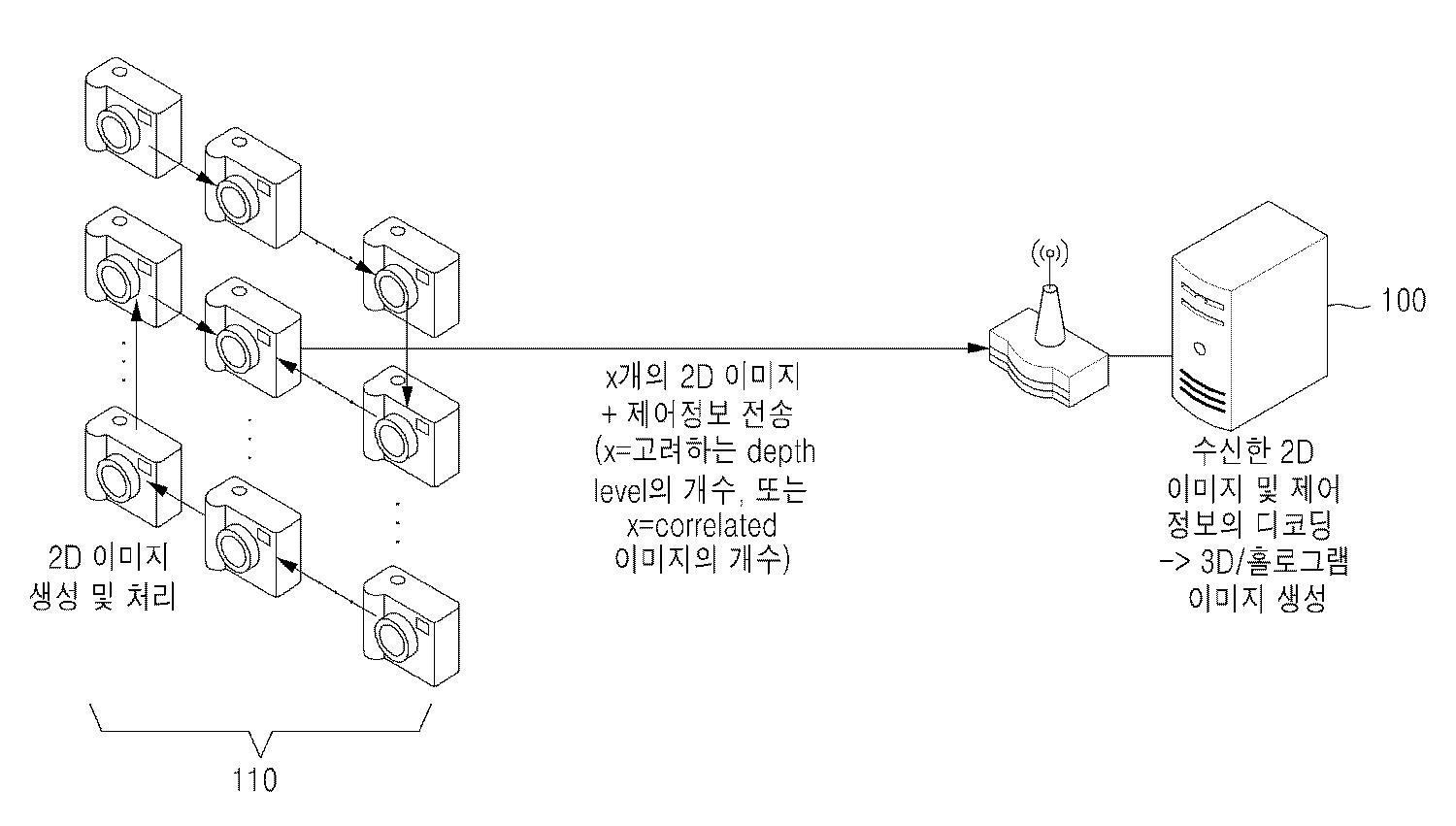 네트워크 기반 다중 카메라 영상 처리 및 데이터 전송 방법 및 그 시스템을 개시한다. 본 발명은 인-네크워크 컴퓨팅(In-Network Computing) 기술을 통하여 사용자에게 실시간 고효율 3D/홀로그램 영상 서비스를 제공하는 것을 그 목적으로 한다. 구체적으로는, 다수의 카메라가 협력하여 3D/홀로그램 이미지를 만드는 경우에 각 카메라가 찍은 정보를 효율적으로 처리 및 전송할 수 있도록 하며, 카메라들 간 프로세싱을 통하여 전송해야 할 정보량을 줄이면서도 최종 3D/홀로그램 이미지의 품질의 손실을 최소화하고자 한다.