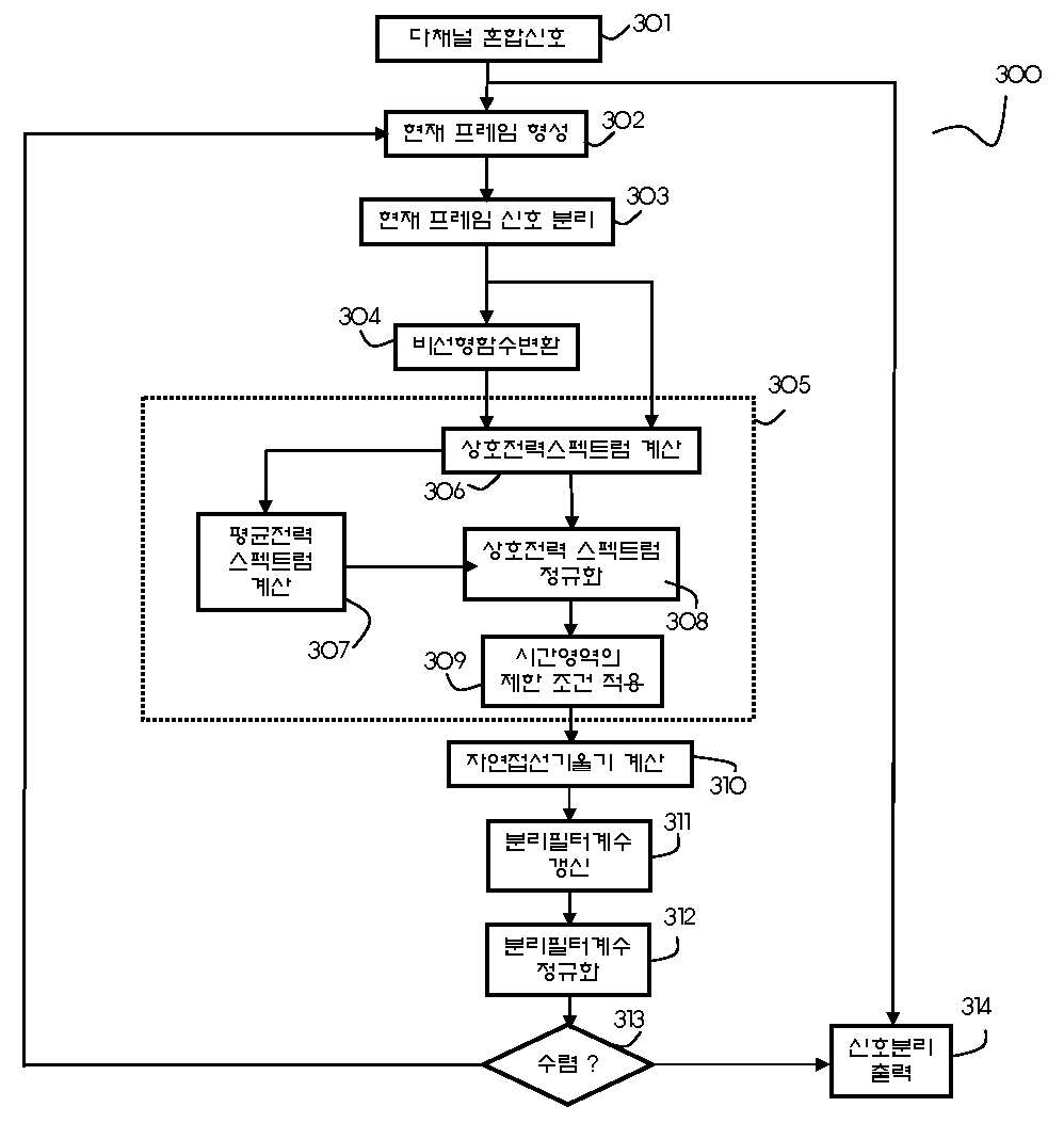 본 발명은 실제 소음 환경에서 다중 경로를 통해 혼합되어 여러 개의 센서(Sensor)를 통해 수집된 음성 및 오디오 신호들로부터 분리필터를 추정하여 원신호를 분리해내는 경우에, 분리필터의 빠른 수렴을 위해 적용되는 자연접선기울기를 주파수 영역에서 효과적으로 적용시킴으로써, 빠르고 안정적인 적응 분리회로를 구현할 수 있는 주파수 영역의 다중경로 다채널 블라인드 혼합신호 분리를 위한 장치 및 그 방법을 제공함.
