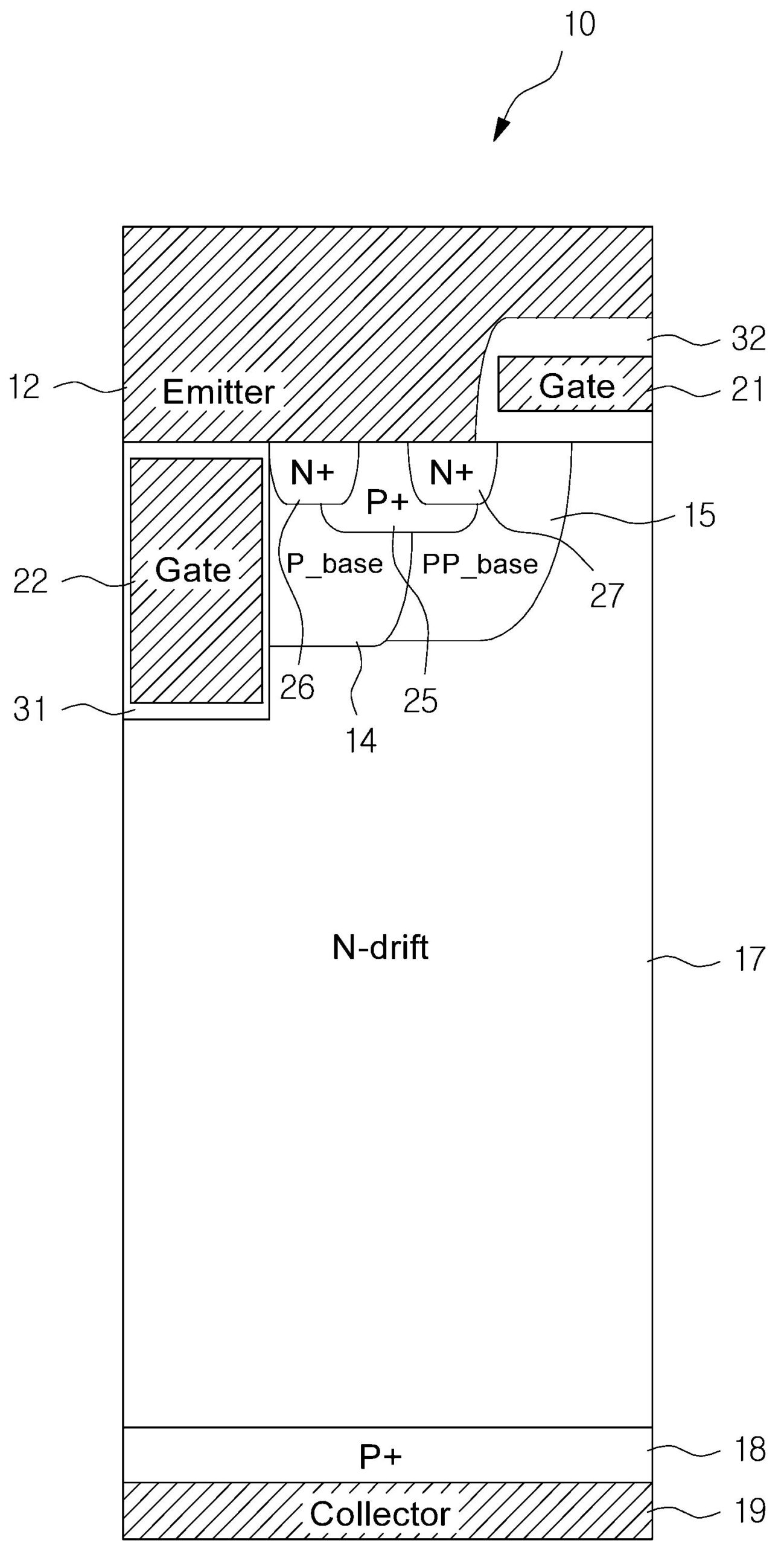 요약 : 일측 하부가 상기 수직형 제2 게이트에 인접하고, 타측은 상기 플래너형 제1 게이트(21)를 둘러싸도록 형성되는 에미터 전극부; 상기 N- 드리프트층 영역 내 상단부의 일부분에 형성되되, 상기 수직형 제2 게이트에 인접하여 형성된 된 제1P-base 영역; 일측부가 상기 제1 P-base 영역의 경계면에 접하여 형성되고, 타측부가 상기 플래너형 제1 게이트의 하부와 인접하여 형성된 제2 PP-base 영역; 상기 제1 P-base 영역 및 제2 PP-base 영역의 경계부의 상단에 형성되는 P+영역; 일측이 상기 수직형 제2 게이트에 인접하고 상부 측이 상기 에미터 전극부의 하측과 접촉되도록 형성되는 제1 N+부; 및 상기 플래너형 제1 게이트의 하부와 상측 일부분이 인접하고, 나머지 상측 부분이 상기 에미터 전극의 하부와 접촉되도록 형성되는 제2 N+부; 를 포함하는 것을 특징으로 하는 듀얼 게이트 구조를 가진 전력 IGBT가 제공된다.