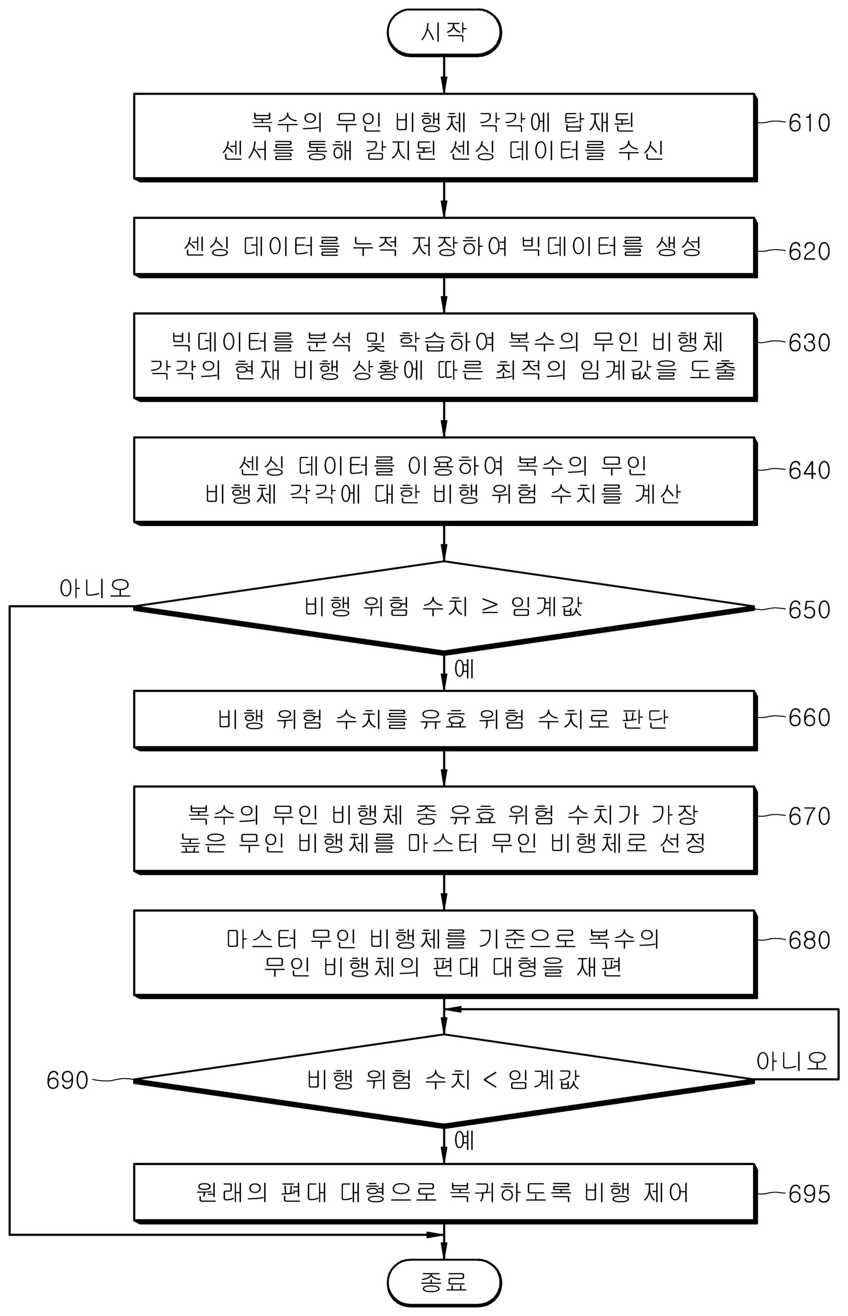 본 발명의 일 실시예에 따른 무인 비행체의 군집 비행 제어 시스템은 복수의 무인 비행체 각각에 탑재된 센서를 통해 감지된 센싱 데이터를 수신하고, 상기 센싱 데이터를 누적 저장하여 빅데이터를 생성하는 빅데이터 생성부; 상기 빅데이터를 분석 및 학습하여 상기 복수의 무인 비행체 각각의 현재 비행 상황에 따른 최적의 임계값을 도출하는 빅데이터 AI 처리부; 상기 센싱 데이터를 이용하여 상기 복수의 무인 비행체 각각에 대한 비행 위험 수치를 계산하고, 상기 비행 위험 수치가 상기 임계값보다 크거나 같은 경우 상기 비행 위험 수치를 유효 위험 수치로 판단하는 위험 판단부; 및 상기 복수의 무인 비행체 중 상기 유효 위험 수치가 가장 높은 무인 비행체를 마스터 무인 비행체로 선정하고, 상기 마스터 무인 비행체를 기준으로 상기 복수의 무인 비행체의 편대 대형을 재편하는 비행 제어부를 포함한다.