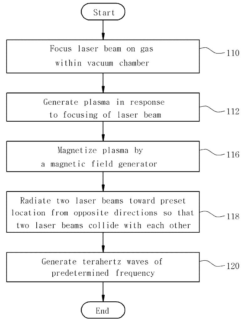 레이저 플라스마를 이용하는 테라파를 생성하기 위한 방법과 장치는 여기에 기술된다. 고전력 테라파를 생성하는 본 방법은 레이저 빔이 미리 설정된 위치에서의 서로 부딪치도록 반대쪽으로부터 자화 플라즈마 안으로 진공실, 방사용 레이저 빔 내에 가스에 레이저 빔을 집중시킴으로써 플라스마를 생성하고, 레이저 빔의 충돌에 의해 생성된 플라스마의 진동을 통해서 소정의 주파수의 테라파를 생성하는 것을 포함한다.