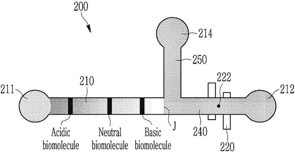 본 발명은 단일 포인트 검출 유형 미체칩 등전위 포커싱에 관한 것이다. 단일 포인트 검출 유형 미체칩 등전위 포커싱은 제 1 및 제 2 전극 부분 사이의 미세 유체 채널 및 양쪽 끝부분에서의 각각의 전극 설계 솔루션을 저장하는 제 1 및 제 2 전극 부분을 포함하는 미체칩을 이용하고, 등전점에 생분자를 분리시키기 위해 각각 거기로의 전기장을 각각의 전극을 제 1 전극 부분과 제 2 전극 부분에 연결하고 적용하는 초점 조절 단계, 제 1 전극 부분 또는 제 2 전극 부분에 있는 전극 용액을 제거함으로써 검출점으로 초점이 맞춰진 생분자를 움직이는 동원 단계, 그리고 검출점을 향하여 작동된 생분자의 검출 단계를 포함한다