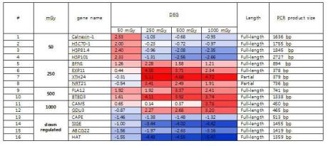 대표청구항 : 타겟이 방사선에 노출되었을 경우 상기 방사선 선량에 따라 상기 타겟에서 상향조절되는 유전자 및 하향조절되는 유전자의 발현양상을 확인할 수 있는 물질을 함유하는 방사선량 감지용 키트에 있어서,상기 하향조절되는 유전자는 CAPE, SIGE, ABCG22, 및 HAT에서 선택된 적어도 1종인 것을 특징으로 하는 방사선량 감지용 키트.