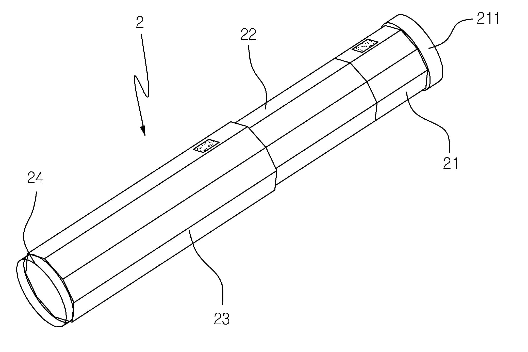 상기 고정 손잡이부와 동일한 정다각형 기둥의 형상을 가지며, 하부의 상기 회전가이드홈에 삽입되는 회전가이드돌기와, 상기 회전가이드돌기의 제1 볼 안착홈에 상응하는 위치에 반원형으로 함몰되는 제2 볼 안착홈과, 제1 및 제2 볼 안착홈에 의하여 형성된 공간에 삽입되는 복수 개의 베어링볼과, 상부 외경면을 따라 형성되는 홈에 장착되는 오링을 구비하는 회전 손잡이부와;