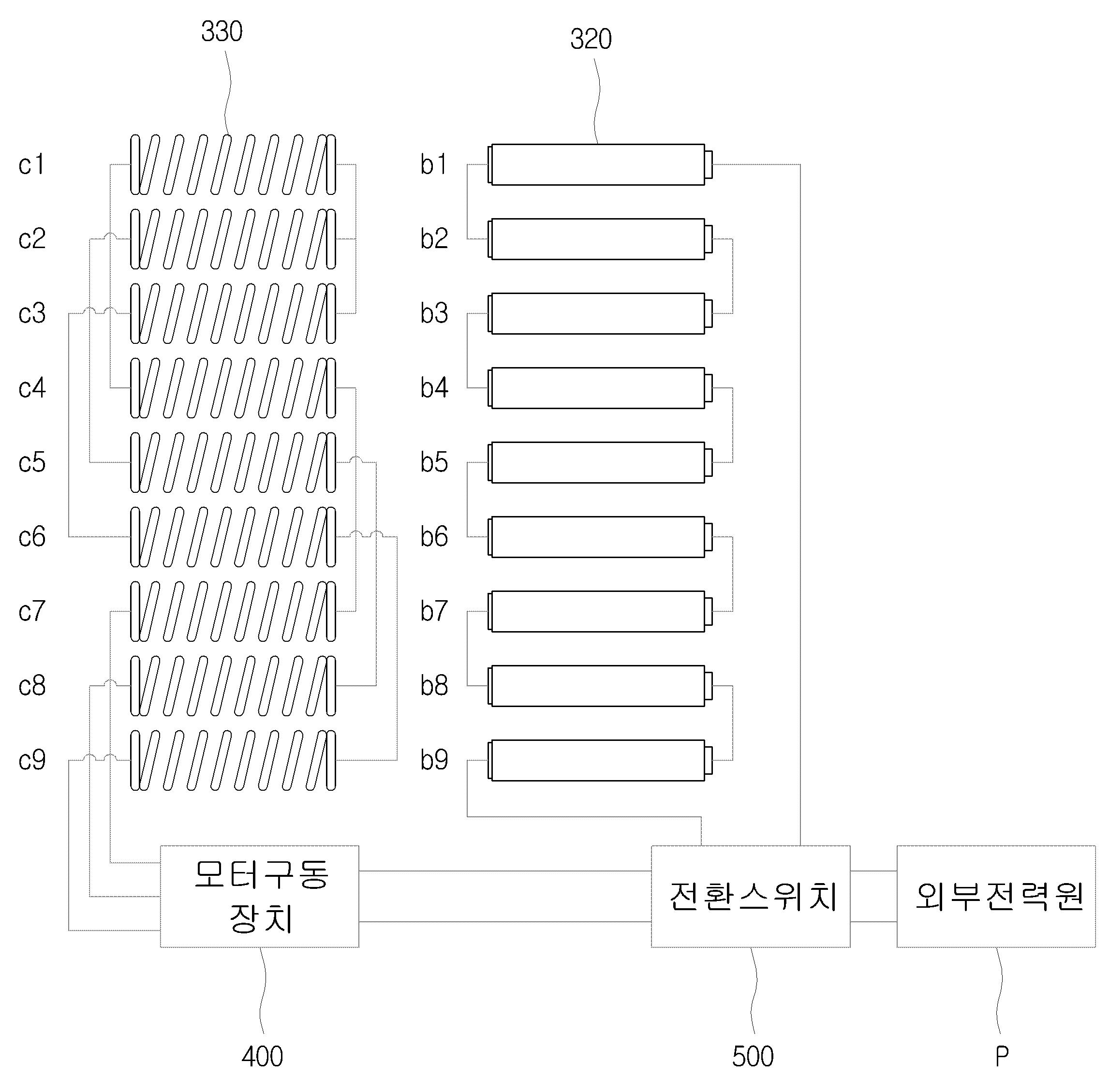 요약 : 본 발명은 별도의 배터리를 갖추지 않고도 회전 구동을 위한 전기에너지를 모터 자체에서 공급하는 배터리 일체형 모터에 관한 것으로, 하우징; 상기 하우징에 회전 가능하게 설치되는 회전자와, 상기 회전자의 둘레를 따라 연결되는 설치대와, 상기 설치대의 원주면을 따라 N극과 S극이 교번해 설치는 다수의 자석을 구비한 회전체; 상기 설치대의 둘레를 감싸듯 설치되는 서포터와, 상기 서포터에 고정되고 자석과 마주하도록 방사형으로 배치되며 도전성 재질의 케이스를 갖춘 다수의 충방전용 코어배터리와, 상기 코어배터리에 각각 권취되며 인가된 전류에 따라 자기장을 일으켜서 회전체에 자력을 가하는 코일을 구비한 전자성체; 상기 코어배터리에 축전 전기를 스위칭하는 전환스위치; 상기 전환스위치로부터 유입된 전기를 코일에 각각 인가하는 모터구동장치를 포함하는 것이다.