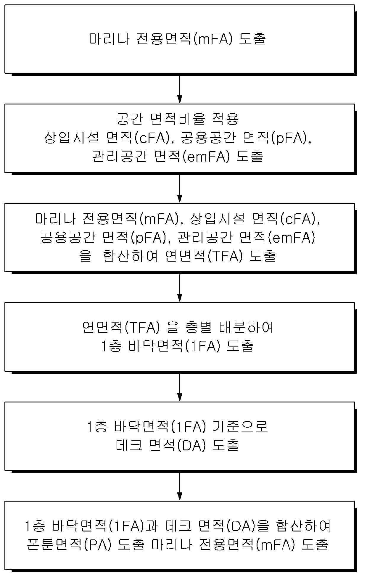 요약 : 본 발명의 일 실시형태에 따른 부유식 마리나클럽 설계방법은 마리나 전용면적(mFA)을 도출하는 단계와; 상기 도출된 마리나 전용면적(mFA)을 기준으로 상업시설 면적(cFA), 공용공간 면적(pFA), 관리공간 면적(emFA)을 도출하여 연면적(TFA)을 도출하는 단계와; 상기 도출된 연면적(TFA)을 건축물 층수에 따라 배분하여 1층 바닥면적(1FA)을 도출하는 단계와; 상기 도출된 1층 바닥면적(1FA)을 기준으로 데크 면적(DA)을 도출하고, 상기 1층 바닥면적(1FA)과 데크 면적(DA)의 합인 폰툰면적(PA)을 도출하는 단계를 포함한다.