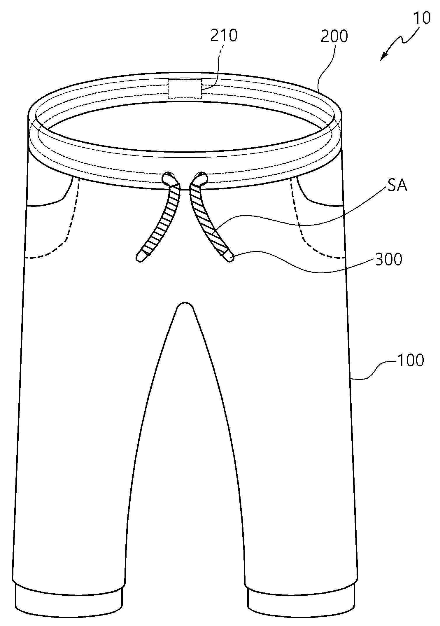 요약 : 본 발명의 실시예에 따른 사이즈를 조절할 수 있는 바지는, 착용자의 하체에 착용되기 위한 바지부; 상기 바지부로부터 연장되며, 상기 바지부를 상기 착용자의 허리에 고정시키기 위한 바지 고정부; 및 상기 바지 고정부의 내부에 배치되며, 끈의 양단에 실리콘이 도포된 도포 영역을 포함하는 바지 끈을 포함하고, 상기 바지 끈의 상기 양단은, 상기 바지 고정부의 중앙부에 형성된 관통 구멍을 통해 상기 바지 고정부의 외부로 나오고, 상기 도포 영역은, 상기 바지 고정부의 내측면에 접촉하고, 상기 바지 끈은 상기 도포 영역과 상기 내측면의 마찰을 통해 고정되는 것을 특징으로 한다.