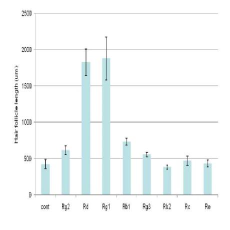 요약 : 본 발명은 발모용 주사제 조성물에 의하면 모낭의 생장을 촉진하고, 두피를 건강하게 유지하여 발모 효능이 우수하고, 인체에 대한 독성이 전혀 없어 안전하면서도 효능이 우수한 발모용 주사제에 관한 것으로, 보다 상세하게는 사포닌 Rg1을 유효성분으로 함유하는 것을 특징으로 하는 발모용 주사제 조성물에 관한 것이다.