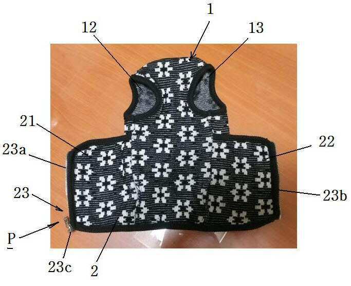 요약 : 본 고안은 애완견에 의류를 입히는 것만으로도 애완견의 소변을 방지할 수 있도록 한 소변 방지 기능을 갖는 애완견 의류에 관한 것으로서, 그 구성은 선단부 중간에 애완견의 얼굴이 통과되어 목에 위치하는 제1 삽입구를 갖고, 제1 삽입구의 후방 양측에 애완견의 앞쪽 양다리가 삽입 및 통과되는 제2 삽입구 및, 제3 삽입구를 갖는 의류부와; 상기 의류부의 후방측에 일체로 형성되고, 의류부를 중심으로 양측에 제1 날개부 및 제2 날개부가 동일 길이로 연장 형성되며, 상기 제1 날개부 및 제2 날개부는 착탈수단에 의해 서로 연결되거나 분리될 수 있게 구성하고, 상기 제1 날개부 와 제2 날개부 사이의 안쪽 중간에 소변을 흡수하는 패드가 삽입되는 패드 포켓을 갖는 소변 방지용 벨트부로 구성된 것이다.