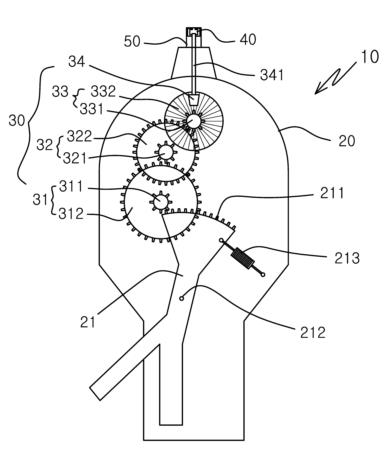 대표청구항 : 수동 코털제거기에 있어서,단부에 부채꼴 형태의 회동기어(211)가 형성된 회동레버(21)를 구비한 몸체(20)와; 상기 회동레버 단부의 회동기어(211)와 결합되는 기어군(30)과; 상기 기어군으로부터 회전력을 전달받아 회전하는 다수의 단위날(41)로 형성된 내부회전날(40)과; 상기 몸체의 단부에 고정설치되고, 내부에는 내부회전날이 동축상으로 밀착배치되고, 다수 형성된 외부통공(52)으로 내입된 콧털은 내부회전날과의 교차에 의해 절단시키는 외부고정날(50);로 구성되고, 상기 회동기어(211)와 기어군(30)은 일방향 회전만 전달되도록 클러치결합이 이루어지되,상기 기어군(30)은,회동기어(211)와 결합되는 제1소기어(311)와, 상기 제1소기어와 같이 회전하는 제1대기어(312)가 동축으로 일체로 구성된 제1이중기어(31)와; 상기 제1대기어(312)와 결합되는 제2소기어(321)와, 상기 제2소기어와 같이 회전하는 제2대기어(322)가 동축으로 일체로 구성된 제2이중기어(32)와; 상기 제2대기어(322)와 결합되는 제3소기어(331)와, 상기 제3소기어와 같이 회전하는 베벨기어(332)가 동축으로 일체로 구성된 제3이중기어(33)와; 상기 베벨기어(332)와 결합되고 피니언축(341)에 의해 회전력을 내부회전날(40)로 전달하는 피니언기어(34);로 구성되고,상기 클러치 결합은,회동레버(21)에는 탄성스프링(213)이 장착되어 가압에 의해 회동후 탄성스프링에 의해 원위치 복원되도록 하고, 상기 몸체(20) 내벽에는 경사면(233)을 갖도록 돌출된 탈거돌기(23)를 형성하여,회동레버(21) 가압시 회동레버의 회동기어(211)가 제1이중기어(31)와 치합되어 회전시키고, 회동기어(211) 후방측이 제1이중기어에 치합되면 회동기어가 형성된 회동레버(21) 부분은 탈거돌기(23)의 경사면(233)을 따라 측면으로 밀려나면서 제1소기어(311)에서 이탈되고, 회동레버의 가압력을 제거하면 탄성스프링(213)의 복원력에 의해 회동레버(21)는 제1이중기어(31)와 치합되지 않은 상태에서 원위치로 복귀되어 제1이중기어와 치합이 이루어지는 것을 특징으로 하는 수동 코털제거기.