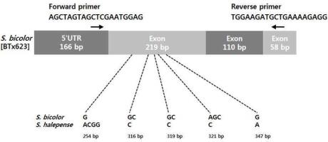 대표청구항 : 서열번호 1의 베타시아노알라닌 합성유전자의 염기서열 중 254번째 염기, 316번째 염기, 319번째 염기 및 321번째 염기에 위치한 Indel(insertion deletion polymorphism)과 347번째 염기에 위치하는 SNP(single nucleotide polymorphism)를 포함하는 85개 이상의 연속된 뉴클레오티드로 구성된 폴리뉴클레오티드 또는 이의 상보적인 폴리뉴클레오티드를 포함하는, 소르검 비콜로르(Sorghum bicolor) 및 소르검 할레펜스(S. halepense)수수 계통의 시안화수소 함량을 판별하기 위한 분자마커 조성물.