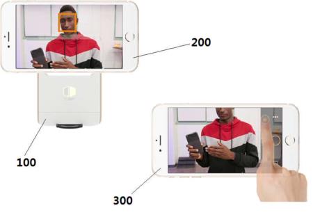 대표청구항 : 스마트폰 거치부와 너트부를 포함하는 스마트폰 거치대;카메라와 스크린이 포함된 제1 스마트폰;손가락에 끼울 수 있는 2개의 손가락 착용물을 포함하고,상기 손가락 착용물은 손가락에 끼울 수 있고, 한쪽 면에는 인식 마커가 표시되어 있고,상기 제1 스마트폰은 스마트폰 거치대의 스마트폰 거치부에 거치 가능하고,상기 스마트폰 거치대의 너트부는 삼각대와 결합될 수 있고,상기 스마트폰 거치부는 상기 너트부를 기준으로 3축으로 회전 가능하고,사용자는 상기 손가락 착용물의 위치와 방향을 조정하여 카메라가 촬영하는 영상의 영상 조정 명령과 스마트폰 거치대의 3축 회전 각도 조정 명령을 상기 제1 스마트폰에 입력할 수 있고,상기 제 1스마트폰은 상기 손가락 착용물에 표시된 인식 마커의 위치 변화로부터 사용자가 입력하는 영상 조정 명령과 3축 회전 각도 조정 명령을 인식한 후, 상기 영상 조정 명령대로 카메라의 촬영 영상을 조정하고 상기 3축 회전 각도 조정 명령은 상기 스마트폰 거치대에 전송할 수 있고,인식마커가 제1 스마트폰의 카메라 촬영영상에 확인되면, 그 인식마커가 인식되는 위치는 사용자가 터치스크린에서 터치한 위치처럼 인식되고, 사용자가 손가락 착용물의 방향을 회전시켜 카메라쪽에서 인식마커가 안 보이도록 하면, 터치스크린에서 터치한 손가락을 뗀 것처럼 인식되고,상기 스마트폰 거치대는 전송받은 3축 회전 각도 조정 명령에 의해 스마트폰 거치대의 3축 회전 각도를 조정하는 것을 특징으로 하는 스마트폰 거치대 시스템.