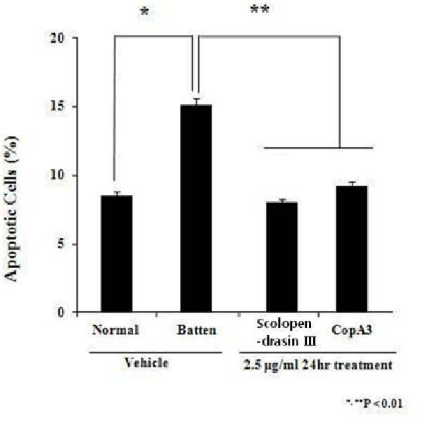 본 발명은 스콜로펜드라신 III을 유효성분으로 함유하는 바텐병 예방 또는 치료용 조성물에 관한 것이다. 본 발명은 스콜로펜드라신 III은 우수한 어팝토시스 감소 효과 및/또는 오토파지 활성화를 통한 세포 기능 정상화 효과에 의해, 바텐병의 예방 또는 치료용 약품의 소재로서 응용될 수 있을 것이다.