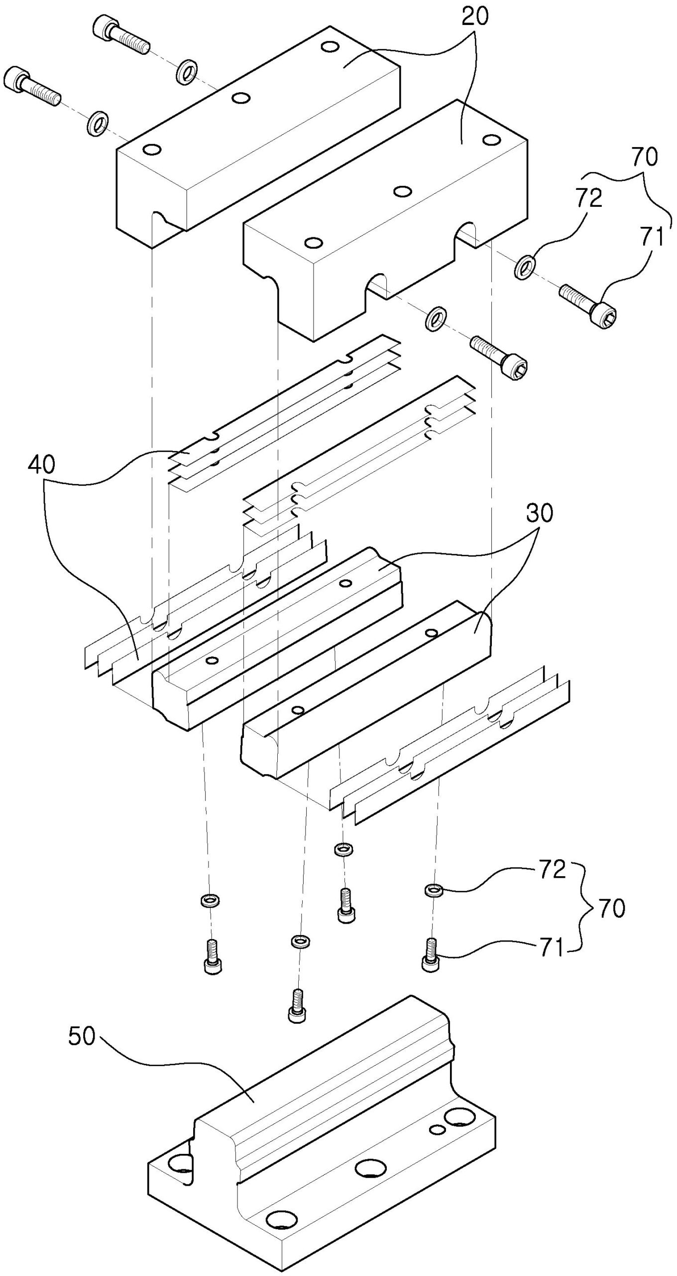 상기 어퍼블록의 체결홈(10)의 상단일측에는 체결홈과 연통되도록 축홈이 형성되고, 상기 펀치의 상단일측에는 축홈내로 삽입되는 회전둔턱이 형성되며,
