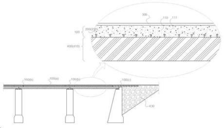 대표청구항 : 슬래브(10)에 있어서,판재형상이며, 콘크리트로 형성되는 지지부(100);상기 지지부 하부에 형성되며, 구조체와 결합되는 결합부(200);상기 지지부 상부에 형성되는 표층부(300);상기 결합부 하부에 위치하며, 교량의 거더, 건물의 빔 또는 토양 중 어느 하나로 형성되는 기초부(400);상기 지지부의 콘크리트로 형성되는 고인성콘크리트(110);상기 지지부 내부에 수용되는 배력철근(120);상기 고인성콘크리트 내부에 규칙 또는 불규칙하게 배치되는 기공(112);상기 기공 내부에 삽입되며, 글라스, 폐플라스틱 비드, 폐기물파우더 중 선택된 어느 하나로 형성되는 삽입물(113);상기 지지부는 거더 상부 구간에만 위치하는 제1지지부(100a);거더 및 거더 사이의 상부에 위치하는 제2지지부(100b);를 포함하며,상기 고인성콘크리트는 시멘트결합재, 잔골재, 물, 섬유, 혼화제의 혼합 조성물로 형성되되, 상기 시멘트결합재는 30~70중량%의 보통포틀랜드시멘트 및 20~40중량%의 고로슬래그, 10~20중량%의 플라이애시를 포함하는 것;상기 잔골재는 규사로 이루어지며, 평균입경은 0.5mm인 것;상기 제1지지부 및 제2지지부는 각각 복수로 형성되어 상기 거더 상부에서 서로 인접하게 배치되며,상기 제1지지부는 복수의 개별판재(140)가 접촉면(130)을 통해 상호 접착되어 복수의 층을 이루며 상하로 적층 형성되며, 상기 제2지지부는 복수의 개별판재(140)가 접촉면(130)을 통해 상호 접착되어 복수의 층을 이루며 상하로 적층 형성되는 것;상기 접촉면은 복수의 홈(141)이 형성되며, 상기 홈은 원형, 타원형, 다각형중 선택된 어느 하나의 형상으로 형성되는 것;상기 결합부는 결합철근(220) 또는 스터드(210)로 형성되는 것;제1지지부 및 제2지지부의 최하층에 적층된 개별판재는 상기 스터드를 수용하되,거더와 접촉되며 상기 스터드를 수용하는 최하층 개별판재는, 스터드를 수용하지 않는 다른 층의 개별판재보다 더 두껍게 형성되는 것;상기 제2지지부의 최하층 개별판재는, 양단면 하부만 스터드로 결합되며 중간부는 스터드가 체결되지 않는 것;을 포함하는 슬래브.