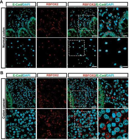 대표청구항 : (1) 대장암 의심 환자로부터, 암이 의심되는 조직 및 정상조직으로 추정되는 그 주변조직을 획득하는 단계;(2) 알비폭스 2(Rbfox2) 단백질을 특이적으로 인식하는 항체와, 상기 획득된 암이 의심되는 조직 및 그 주변조직에 함유된 알비폭스 2(Rbfox2) 단백질을 반응시키는 단계;(3) 상기 단계 (2)의 반응 이후에, 암이 의심되는 조직 및 그 주변조직의 세포질에 함유된 알비폭스 2(Rbfox2) 단백질의 함량을 각각 측정하는 단계; 및 (4) 상기 단계 (3)에서 측정된 암이 의심되는 조직의 세포질에 함유된 알비폭스 2(Rbfox2) 단백질 함량과 암이 의심되는 조직의 주변조직의 세포질에 함유된 알비폭스 2(Rbfox2) 단백질 함량을 비교하여, 암이 의심되는 조직의 세포질에 함유된 알비폭스 2(Rbfox2) 단백질의 함량이 그 주변조직의 세포질에 함유된 알비폭스 2(Rbfox2) 단백질 함량보다 높을 경우, 암으로 판별하는 단계;를 포함하는 대장암 진단에 필요한 정보를 제공하는 방법.