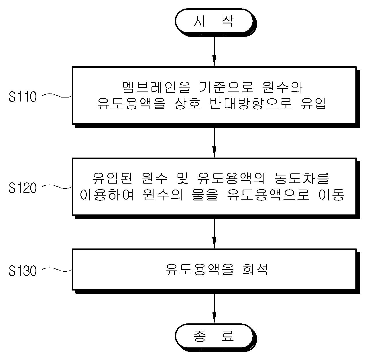 본 발명은 액상비료를 유도용액으로 사용하는 정삼투 기반의 해수담수화방법에 관한 것이다. 본 발명에 따른 액상비료를 유도용액으로 사용하는 정삼투 기반의 해수담수화방법은 멤브레인을 기준으로 원수와 유도용액을 상호 반대방향으로 유입하는 단계; 상기 유입된 원수 및 유도용액의 농도차를 이용하여 상기 원수의 물을 유도용액으로 이동시키는 단계; 및 상기 유도용액을 희석하는 단계를 포함하는 것을 특징으로 이에 의하여, 유도용액의 회수공정 및 재생공정을 생략할 수 있고, 투과플럭스를 증가시킬 수 있으며, 적은 에너지를 이용하여 농업 관개수의 생산이 가능하다.