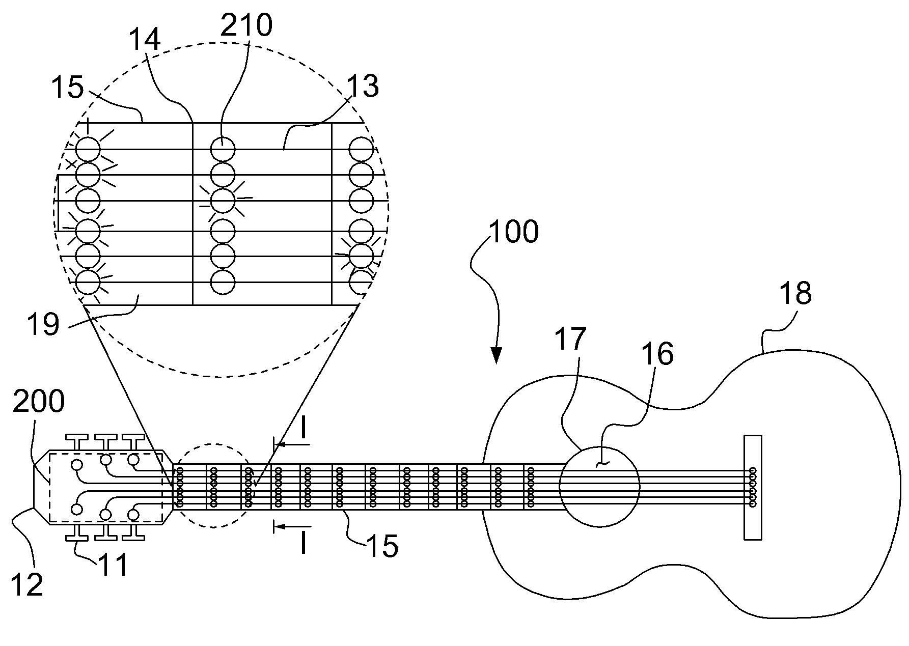 본 발명은 단말기로부터 전송된 악보에 따라 연주자가 쉽게 기타를 연주할 수 있도록 기타 연주의 운지 위치를 표시하는 연주 코드 가이드 기타에 관한 것이다. 본 발명의 연주 코드 가이드 기타는 복수의 줄감개를 구비한 헤드, 복수의 줄과 음쇠를 구비한 네크 및 울림통과 울림구멍을 포함한 바디를 포함하여 구성된 기타에 있어서, 상기 네크에 설치되어 기타 연주 코드의 운지 위치를 시각적으로 표시하는 코드표시부; 및 외부의 단말기로부터 전송된 기타 연주 코드 정보에 대응되는 운지 위치가 상기 코드표시부로 표시되도록 제어하는 코드제어부를 포함한다. 따라서, 코드제어부가 단말기로부터 악보를 수신하며 코드표시부가 수신된 악보의 기타 연주 코드 운지 위치를 빛 또는 숫자로 표시하여 초보 연주자도 쉽게 기타를 연주하고 비교적 적은 비용으로 기타를 스스로 학습할 수 있다.