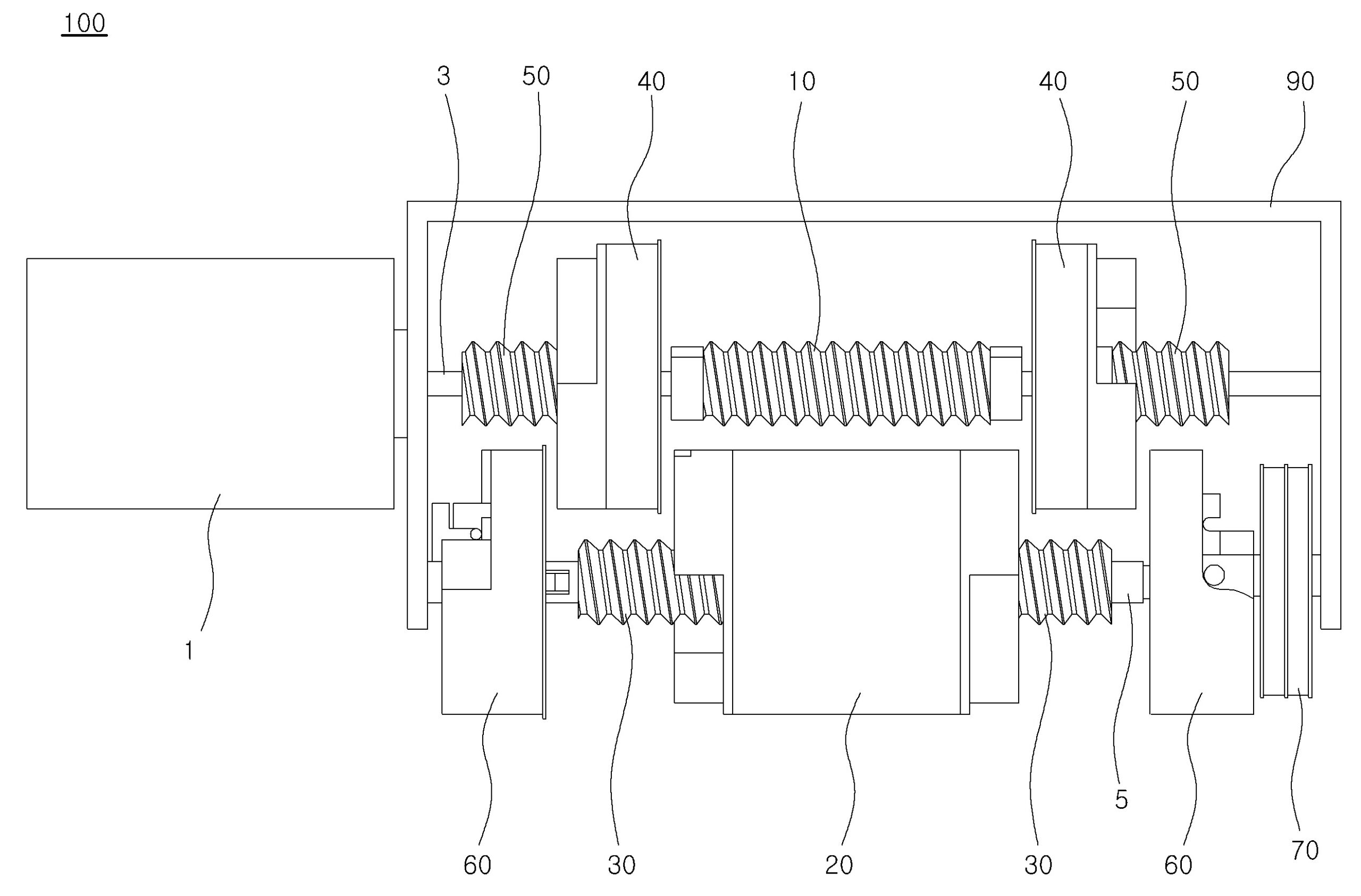 와이어 감속기가 제공된다. 본 발명의 일 실시예에 따른 와이어 감속기는 모터축에 연결된 제 1 입력축, 상기 모터축의 상부 또는 하부 방향으로 이격되어 상기 모터축과 평행하게 형성된 지지축, 상기 지지축에 형성되며 상기 제 1 입력축과 상부 또는 하부 방향으로 이격되어 배열된 적어도 하나의 제2 입력축, 상기 제 2 입력축과 동일한 축에 형성되어 상기 제 2 입력축과 결합되는 제 1 출력축, 상기 제 1 입력축과 동일한 축에 형성되며, 상기 제 1 입력축의 외곽에 배열되는 적어도 하나의 제 2 출력축, 상기 제 2 출력축과 동일한 축에 형성되어 상기 제 2 출력축과 결합되는 제 3 입력축 및 상기 제 2 입력축과 동일한 축에 형성되며 상기 제 3 입력축과 상부 또는 하부 방향으로 이격되어 상기 제 2 입력축의 외곽에 배열되는 적어도 하나의 제 3 출력축을 구비하되, 하나의 와이어가 상기 제 1 입력축으로부터 상기 제 1 출력축으로 연결되어 상기 제 1 출력축에 감기며, 상기 제 1 출력축에 감겨진 와이어는 상기 제2 입력축으로 감기고, 상기 제2 입력축에 감겨진 와이어는 상기 제2 출력축으로 순차적으로 감김으로써, 상기 모터축이 회전함에 따라 상기 제1 입력축, 상기 제 1 출력축, 상기 제 2 입력축 및 상기 제 2 출력축이 회전하며, 상기 제 2 출력축에 감겨진 와이어는 상기 제 3 입력축으로 감기며, 상기 제 3 입력축에 감겨진 와이어는 상기 제 3 출력축에 순차적으로 감김으로써, 상기 모터축이 회전함에 따라 상기 제 3 입력축과 상기 제 3 출력축이 회전하는 것을 특징으로 한다.