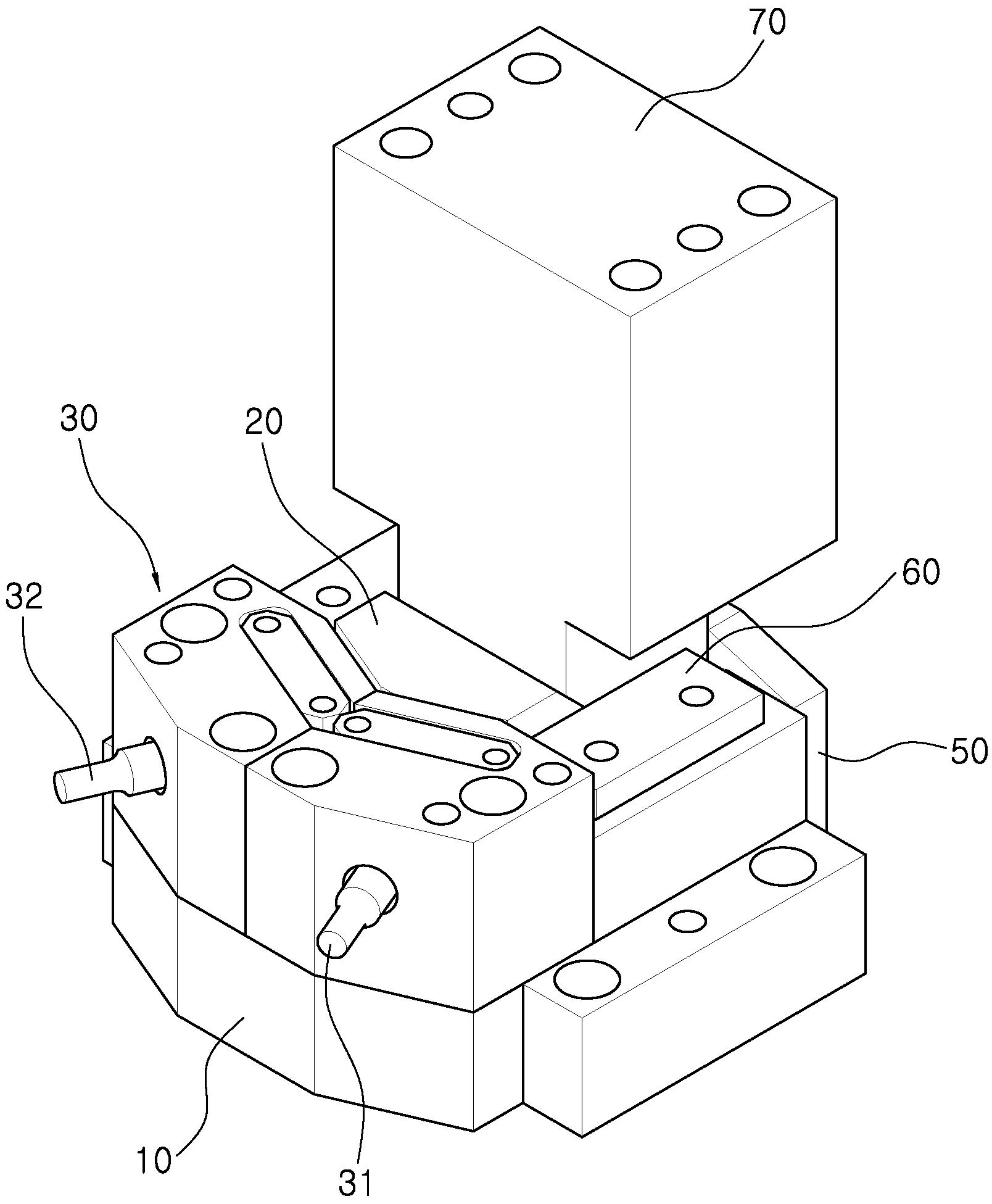 본 발명은 하형에 고정설치되는 캠베이스와, 캠베이스 상에 슬라이딩되도록 설치되고 작동경사면을 구비하는 캠푸시블록과, 캠베이스의 선단 상부면에 고정설치되고, 내부에 위치하는 제1,2 피어스펀치가 캠푸시블록에 의해 서로 다른 방향으로 동시에 작동되는 펀치유니트와, 캠베이스와 캠푸시블록 사이에 위치하도록 캠베이스의 스프링설치홀내에 설치되어 캠푸시블록이 후단방향으로 이동되도록 탄성력을 구비하는 리턴스프링부와, 캠베이스의 후단에 고정설치되어 캠푸시블록의 슬라이딩범위를 제한하는 스토퍼와, 캠푸시블록의 날개 상측에 위치하도록 캠베이스의 일측에 볼트결합되어 캠푸시블록의 이탈을 방지하는 가이드플레이트와, 캠푸시블록의 작동경사면과 접촉되면서 미끄러지는 구동경사면을 구비하고 상형에 연결설치되는 캠드라이브를 포함한다.