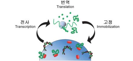 대표청구항 : 제 1 포획체로서 바이오틴이 결합된 타겟유전자 주형이 접합된 스트랩타비딘 및 제 2 포획체로서 타겟 유전자에 접합되지 않고 바이오틴이 결합된 Ni-NTA가 접합된 스트랩타비딘이 모두 코팅된 마이크로비드가 담지된 하이드로 겔을 포함하는 동소 고정(in situ) 단백질 합성용 겔-매트릭스.