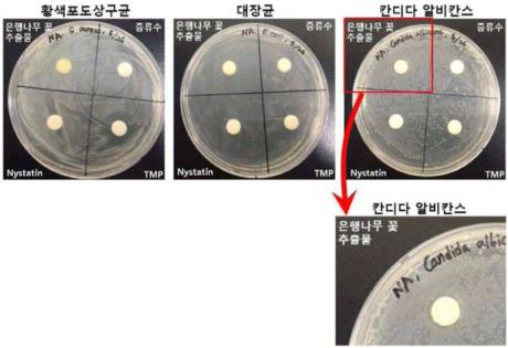 대표청구항 : 은행나무 꽃(Ginko biloba flower) 추출물을 유효성분으로 포함하는 항진균 조성물에 있어서,상기 은행나무 꽃 추출물은 은행나무 꽃을 메탄올로 추출한 추출물이며, 상기 진균은 칸디다 알비칸스(Candida albicans)인 것을 특징으로 하는 항진균 조성물.