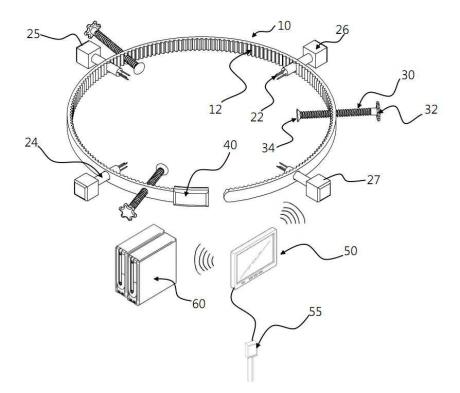 대표청구항 : 복수개의 관통홀(28, 29)이 형성되고 일측에 체결부가 형성되어 수목에 조임 설치되는 바디부(10);상기 바디부의 관통홀에 삽입되며, 수목삽입바늘의 일부가 수목에 삽입되어 수목의 상태를 측정하는 복수개의 수목삽입바늘부(20);외부에서 수목을 향하도록 상기 바디부에 형성된 상기 관통홀에 삽입 설치되어 수목과 상기 바디부를 고정하는 복수개의 조임체결부(30);상기 바디부의 끝단으로부터 연장되어 형성되며, 상기 바디부의 다른쪽 끝단이 삽입되도록 내부에 공간을 제공하고, 내부 공간상에는 상기 바디부의 다른쪽 끝단이 삽입되어 고정되기 위한 체결부(40);상기 수목삽입바늘부(20)와 토양정보측정센서(55)로부터 측정되는 측정데이터가 저장되는 저장부와 측정된 측정데이터를 연산처리하는 제어처리부와 측정데이터정보와 설정버튼이 표시되는 모니터부 및 외부 데이터베이스 서버로 송수신하는 통신수단, 대기정보측정센서, 위치정보센서가 포함되는 컨트롤러(50);상기 수목의 주변에 설치되어 토양의 상태를 측정하는 토양정보측정센서(55);표준 수목의 수목활력도 평가지표가 저장되어 있으며, 상기 컨트롤러에서 전송된 각종 측정 데이터를 비교분석하여 그 결과를 상기 컨트롤러 또는 관리자 단말기로 전송하는 외부데이터베이스 서버(60);를 포함하며, 상기 수목삽입바늘 및 토양정보측정센서(55)를 통해 수목의 활력도 및 토양의 상태를 측정하고, 일정 시간 후에 다른 수목삽입바늘을 통해 수목의 활력도 및 토양의 상태를 측정하는 것을 반복하고,상기 복수의 수목삽입바늘부(20)에는 컨트롤러와 유무선으로 통신할 수 있는 통신수단이 포함되고, 고유 ID가 부여될 수 있으며, 상기 수목삽입바늘부(20)의 각 삽입부에는 모터, 랙기어, 피니언 기어가 더 포함되어 수목삽입바늘이 수목의 내부로 전진 및 후진하며 침입 및 후퇴될 수 있도록 하며,상기 바디부(10)에 수목삽입바늘부(20)가 복수개가 구비되는 경우, 컨트롤러에서 일정시간 간격으로 수목삽입바늘부(20)의 각 제1삽입부(24), 제2삽입부(25), 제3삽입부(26), 제4삽입부(27)의 수목삽입바늘(22)이 작동되도록 설정하면 제1삽입부(24)의 수목삽입바늘이 수목에 삽입되어 수목의 상태를 측정하고 후퇴하고 나서, 설정된 시간이 되면 상기 제2삽입부(25)의 수목삽입바늘(22)이 수목에 삽입되어 수목의 상태를 측정하고 후퇴하며, 상기 제3삽입부(26)와 상기 제4삽입부(27)의 바늘도 연속적으로 수목에 삽입되어 수목의 상태를 연속적으로 측정하는 것을 특징으로 하는 자동화된 수목활력도 측정용 수목진단시스템.