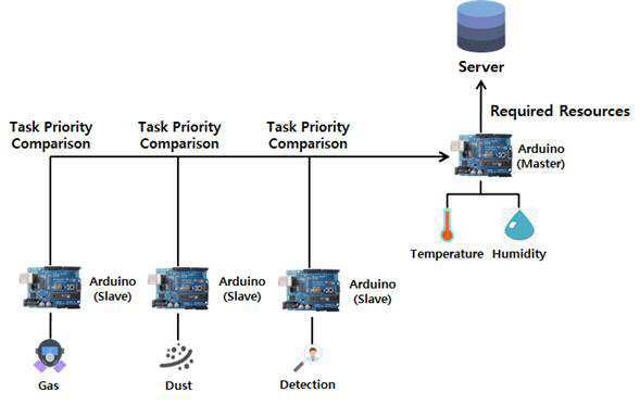 본 발명의 일 실시예에 따른 자원 할당 알고리즘 기반 IoT 분산 처리 시스템은 센서 데이터를 수집하여 미리 설정된 임계값을 통해 작업의 발생 유무를 판단하는 복수의 디바이스; 및 상기 복수의 디바이스 중 상기 작업이 발생된 것으로 판단한 디바이스를 마스터(Master) 디바이스로 설정하고 나머지 디바이스를 슬레이브(Slave) 디바이스로 설정하며, 상기 마스터 디바이스로부터 각 디바이스별 작업 우선순위의 비교 결과를 수신하여 해당 디바이스의 동작에 필요한 자원을 할당하는 서버를 포함한다.
