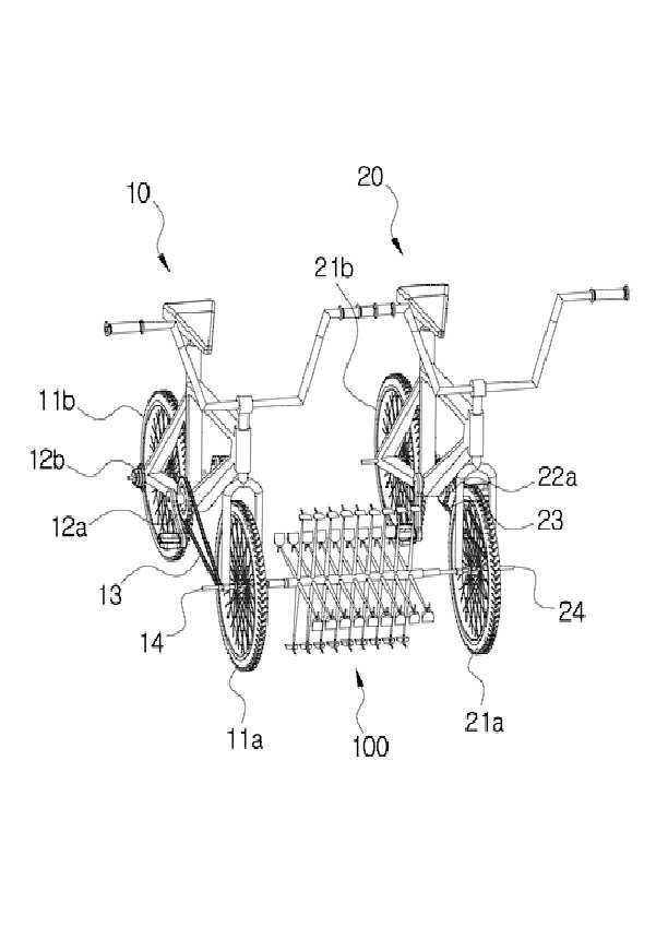 요약 : 본 발명은 한 쌍의 자전거(10,20)의 앞바퀴(11a,21a) 및 뒷바퀴(11b,21b) 중 어느 하나의 바퀴에 대한 회전샤프트와 함께 회전하는 구동부(14,24)와 결합되는 자전거용 파종기(100)에 있어서, 하나의 자전거(10)의 구동부(14)와 연결되는 제1결합부(110); 다른 하나의 자전거(20)의 구동부(24)와 결합되는 제2결합부(120); 일단이 상기 제1결합부(110)와 결합되고 타단이 상기 제2결합부(120)와 결합되는 회전축(130); 및 상기 회전축(130)의 외주면에 결합되는 회전어셈블리(140);를 포함하고, 상기 회전어셈블리(140)는, 일단이 상기 회전축(130)에 결합되고 타단에 씨뿌리개(141-3)가 배치되는 적어도 하나 이상의 작업기구(141)를 포함하여 수작업 대비 보다 빠른 시간에 작업이 이루어지도록 하되, 보다 많은 농민들이 사용할 수 있는 자전거용 파종기에 관한 것이다.