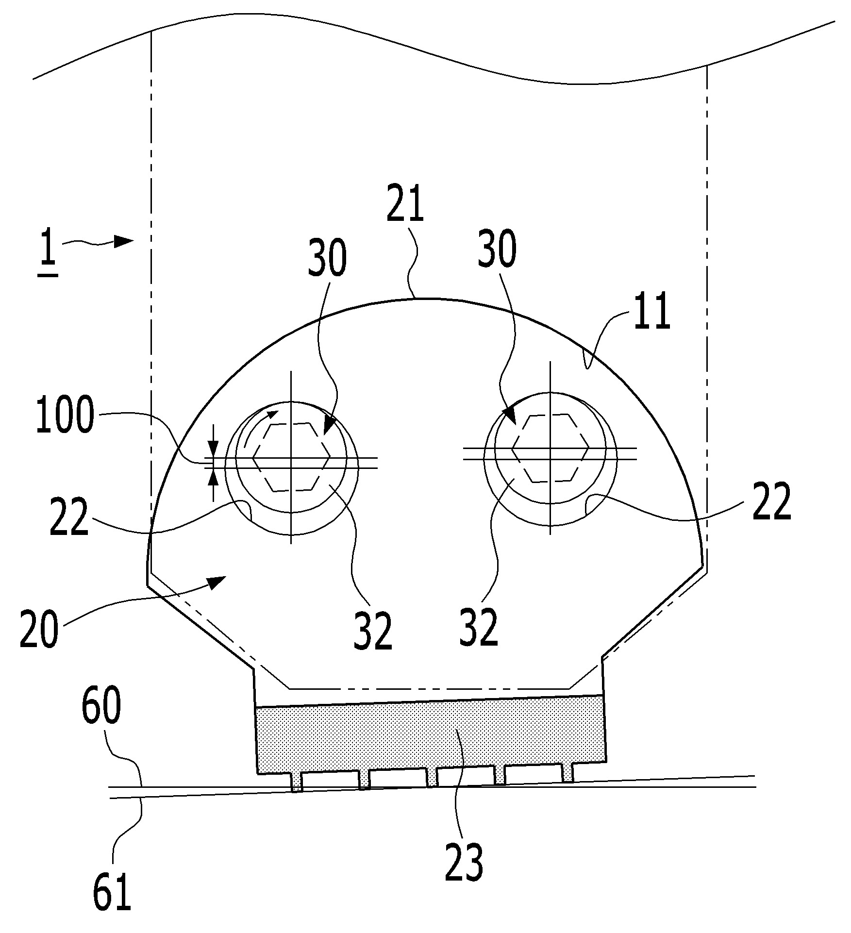 본 발명은 화학 기계적 연마 시스템의 회전식 표면 테이블에 배열된 연마패드의 표면에 수직적으로 배치되는 공구홀더에 바이트를 형성하는 정밀조절용 멀티그루브 절삭공구에 있어서의 공구홀더에 장착되는 복수의 날을 가지는 바이트가 유지편에 의하여 지지되도록 하면서 유지편에 형성한 위치조절나사들에 의하여 바이트 날과 연마패드와의 평형이 미크론 단위의 고정밀 조절로 위치결정이 유지될 수 있도록 함으로써, 공구홀더를 기기본체에 장착하기 전,후에 관계없이 바이트 날의 좌,우방향의 오차 범위 공차를 최소화할 수 있고, 또한 공구홀더의 바이트 날의 조절시간이 비약적으로 단축되어 공구 교환시 발생하는 비 가공시간을 줄여 생산성을 높일 수 있는 정밀조절용 멀티그루브 절삭공구에 관한 것으로, 본 발명은 공구홀더에 장착되는 복수의 날을 가지는 바이트가 유지편의 고정나사에 의하여 고정되고, 이 공구홀더가 기기본체의 장착되어 연마패드에 수직으로 바이트 날들이 평형을 이룰 수 있도록 된 정밀조절용 멀티그루브 절삭공구에 있어서, 공구홀더(1)의 바이트(20)이 장착되는 인서트홈(10)과 바이트(20)의 기초부가 서로 암수원호면(11,21)들로 접촉되고, 유지편(40)에는 바이트(20)을 고정할 수 있는 고정나사(50)과 이웃하여 상기 바이트(20)에 형성한 테이퍼홈(22)과 비틀림 접촉될 수 있는 위치조절나사(30)들이 나선 결합되어, 상기 위치조절나사(30)들의 회동에 따라서, 바이트(20)의 숫원호면(21)이 인서트홈(10)의 암원호면(11)에 미끄럼접촉으로 이동될 수 있도록 되어서, 바이트(20)의 평면 중심선에 대하여 직각으로 유지되는 바이트 날(23)들이 평형하게 조절될 수 있고, 또한 본 발명의 상기 바이트(20)에는, 유지편(40)에 나선결합되는 위치조절나사(30)들에 연장되어 형성된 테이퍼면(32)가 바이트(20)의 테이퍼홈(22)과의 교호로 결합되어, 상기 위치조절나사(30)들의 회동에 따라서, 바이트(20)의 기초부의 숫원호면(21)이 인서트홈(10)의 암원호면(11)에 미끄럼접촉으로 이동될 수 있으며, 또한 본 발명의 공구홀더(1)의 인서트홈(10)에 장착되는 바이트(20)의 테이퍼홈(22)은, 상기 유지편(40)의 위치조절나사(30)들이 나선결합되는 나사구멍(41)의 수직 중심선에 대하여 편차(100)를 두고 형성되어, 상기 위치조절나사(30)들의 조절에 따라서, 위치조절나사(30)의 테이퍼면(32)가 상기 바이트(20)의 테이퍼홈(22)과 비틀림힘에 의하여 바이트(20)의 테이퍼홈(22)에 대응하는 바이트(20)의 숫원호면(21)이 인서트홈(10)의 암원호면(11)에 미끄럼 이동될 수 있고, 또한 본 발명의 바이트(20)의 테이퍼홈(22)에 대응하는 바이트(20)의 숫원호면(21)이 인서트홈(10)의 암원호면(11)에 미끄럼 이동은, 바이트(20)의 평면 중심선에 대하여 직각으로 유지되는 바이트 날(23)들이 평형하게 조절되어 유지할 수 있으며, 또한 본 발명의 공구홀더(1)의 유지편(40)내에 설치되는 인서트홈(10)의 기초부가 암원호면(11)을 이루고, 또한 이 인서트홈(10)에 장착되는 바이트(20)의 기초부도 숫원호면(21)을 이루도록 되어, 상기 암수원호면(11,22)들과의 미끄럼 접촉으로 바이트(20)의 첨단의 바이트 날(23)이 바이트(20)의 평면 중심선에 대하여 좌,우방향의 움직일 수 있고, 상기 바이트 날(23)이 바이트(20)의 평면 중심선에 대하여 좌,우방향의 움직임은, 유지편(40)에 간격을 두고 형성한 위치조절나사(30)들의 조임과 풀림조절에 의하여 행하여질 수 있다.