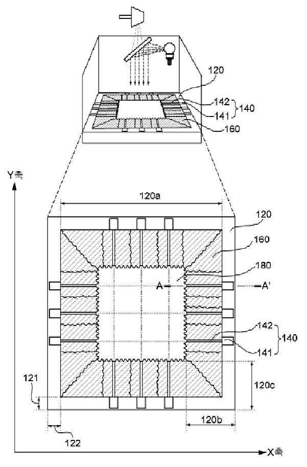 이에 의해 방사선사는 용이하게 피사체의 형태와 굴곡에 맞는 정확하고 미세한 차폐수단(160)의 모양 조절을 할 수 있다. 상기 차폐수단(160)은 엑스선을 차단하고, 차폐수단(160)의 중앙에 형성된 투과창(180)으로는 엑스선이 투과되어, 투과창(180)의 모양에 따라 엑스선의 조사야가 특정된다.