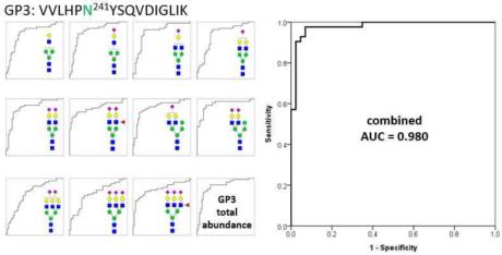 요약 : 표적 당단백질의 부위 특이적 당쇄화 정보는 질병 진단에 고민감도 바이오마커를 제공할 수 있다. 일반적으로 부위 특이적 당쇄화 분석은 두 가지 다른 방법, 즉 트립신 소화를 이용한 프로테옴 접근과 탠덤 MS를 이용한 프로테옴 접근 또는 프로네이즈 소화를 이용한 글리코믹스 접근 방식으로 수행되었다. 그러나 기존의 두 가지 접근방식의 데이터 처리와 해석은 어렵고 지루하며 시간이 많이 소요되었다. 따라서 다량의 임상 시료 세트에 대해 높은 고민감도와 고특이성을 나타내는 용이하고 직접적인 방법이 요구되어 왔다. 본 발명에서는 표적 혈청 합토글로빈(Hp)을 위한 중간-상하향 글라이코프로테옴 방법을 발명하여 비교적 간단한 시료 준비와 데이터 처리 및 해석방법으로 임상 시료를 분석하여 위암 바이오마커를 발견하였다. 트립신이 생성하는 Hp의 글라이코폼은 펩타이드 순서에 따라 3개의 당펩타이드 군으로 분류할 수 있으며, 각각 3개 군에서 10, 15, 14개의 잠재적 바이오마커(p < 0.0001)가 발견되었다. 바이오마커를 보완하고 개선하기 위해 다변량 로지스틱 회귀 분석 모델을 3개 군의 잠재적 당펩타이드 바이오마커에 적용하였다. 결합된 바이오마커의 ROC 곡선은 AUC 값이 0.974, 0.931 및 0.980으로 건강한 대조군과 위암 환자 사이에 강한 차이를 나타냈다.