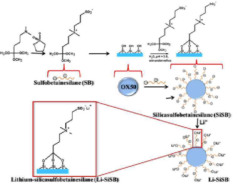 포베타인 실란(Sulfobetaine silane, SB)을 실리카에 이식하여 실리카 설포베타인 실란(Slica sulfobetaine