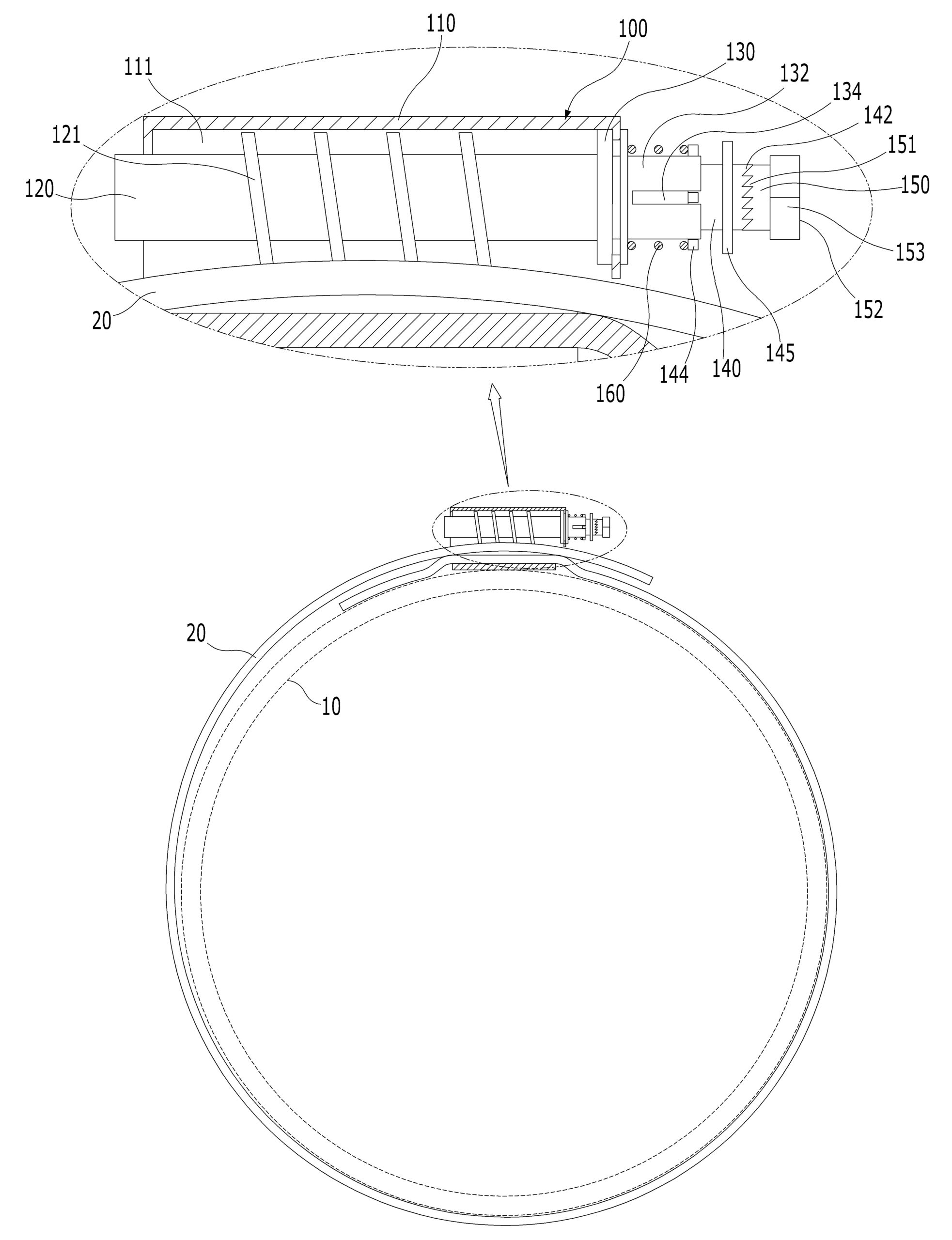 요약 : 걸림홀이 형성된 밴드 및 조절부를 포함하며, 조절부는 하단에 밴드의 일측이 결합되고, 밴드의 타측이 통과되도록 작동홀이 전후로 관통되는 본체와, 작동홀 내에서 회전 가능하고, 반경방향의 나사산이 걸림홀에 걸림 위치되며, 후단으로부터 연결축이 돌출되는 나사부와, 작동홀의 내부에 결합되어 나사부의 후방에 배치되고, 연결축이 전후로 관통되는 걸림부와, 걸림부의 후방에서 전진 및 후퇴 가능하게 배치되어 연결축이 전후로 관통되고, 후면에 제1톱니가 형성되는 이동부와, 이동부의 후방에서 연결축에 결합되고, 전면의 제2톱니가 제1톱니와 맞물림 결합시 일방향 회전이 방지되는 조작부 및, 걸림부의 후면과 이동부의 전면을 전후방향으로 탄성 지지하여 이동부를 후방으로 복귀시키는 탄성 지지부를 포함한다.