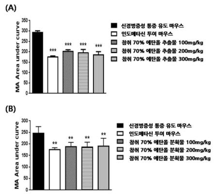 요약 : 본 발명은 참취(Aster scaber) 추출물을 유효성분으로 포함하는 신경병증성 통증 예방 또는 치료용 조성물에 관한 것으로, 본 발명의 참취 에탄올 추출물이 신경병증성 통증 마우스 모델에서 기계적 이질통의 개선 효과가 우수하다는 것을 확인하였고, 이를 통해, 본 발명의 참취 에탄올 추출물을 이용하여 신경병증성 통증 개선 효과가 우수한 치료제 또는 건강기능식품의 개발이 가능할 것으로 기대된다.