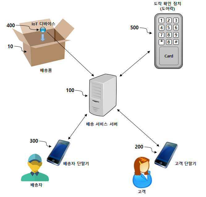 요약 : 이러한 배송 서비스 시스템은 도착 확인 장치, IoT 디바이스 및 배송 서비스 서버를 포함한다. 상기 도착 확인 장치는 배송지에 배치되고, 도착 확인용 번호의 입력에 의해 배송 완료 신호를 생성할 수 있다. 상기 IoT 디바이스는 배송품과 함께 이동하여 현재 위치 정보를 생성할 수 있다. 상기 배송 서비스 서버는 고객 단말기로부터 상기 배송지를 포함하는 송장 정보를 수신하고, 상기 IoT 디바이스로부터 상기 현재 위치 정보를 수신하며, 상기 현재 위치 정보를 이용하여 상기 IoT 디바이스가 상기 배송지로부터 배송 기준 거리 내로 진입한 것으로 판단하면, 도착 예정 메시지를 상기 고객 단말기로 전송하고 상기 도착 확인용 번호를 배송자 단말기로 전송하며, 상기 도착 확인 장치로부터 상기 배송자 단말기로 전송된 상기 도착 확인용 번호에 의해 생성된 상기 배송 완료 신호를 수신한 후, 배송 완료 메시지를 상기 고객 단말기로 전송한다. 이로써, 고객은 배송품의 도난 발생 없이 안전하게 배송되었음을 용이하게 확인할 수 있다.