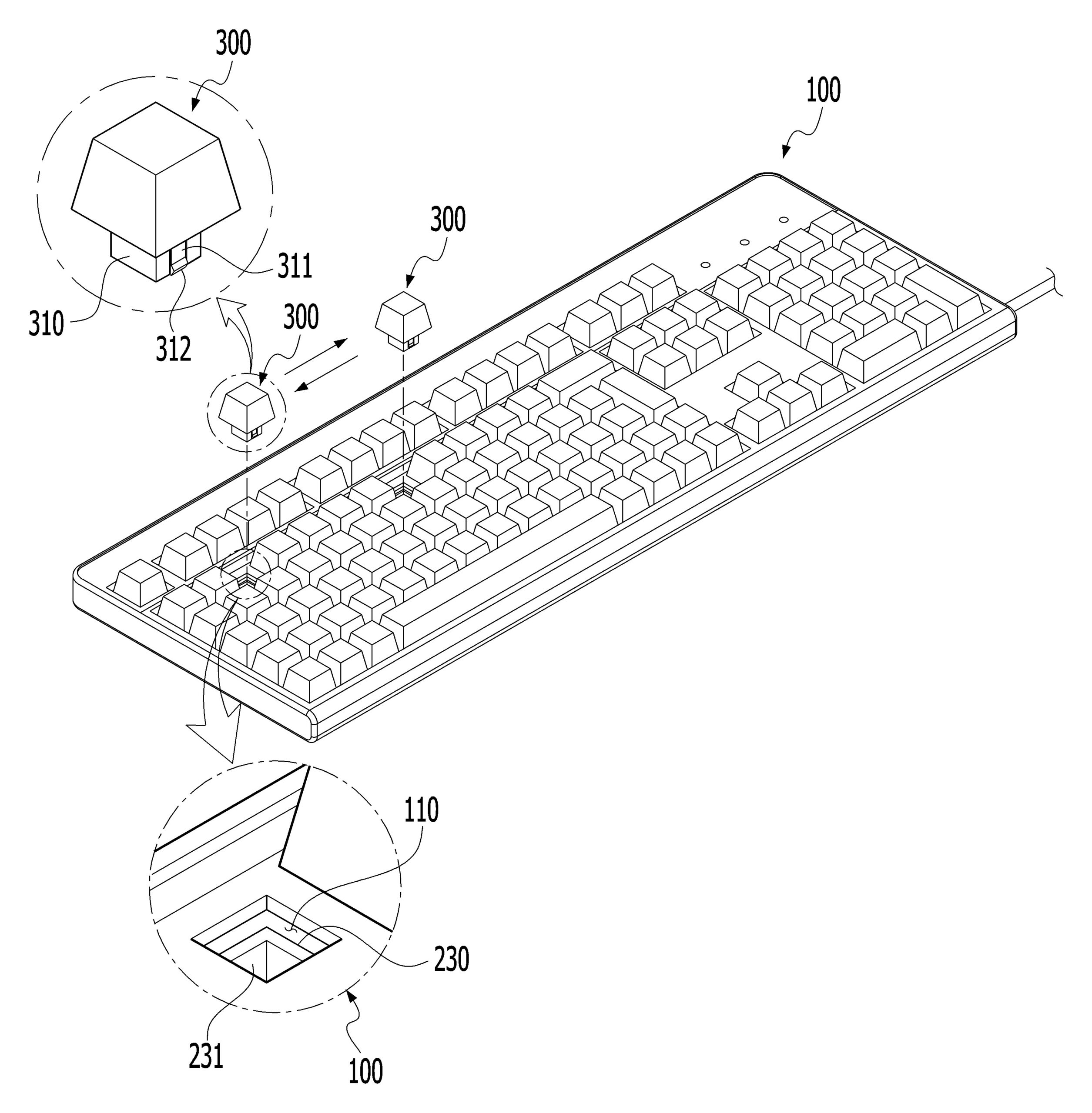 본 발명은 키보드에 관한 것으로, 본체와, 상기 본체에 설치되고, 상부에 다수의 접속부가 위치되는 기판과, 상기 접속부의 상부에 각각 결합되고, 하강시 상기 접속부를 접점동작 시킨 후 탄성력에 의해 상승 복귀되는 다수의 스위치 및, 상기 스위치에 각각 설치되어 상기 접속부와 접속되고, 상기 스위치에 따른 고유 입력값이 기설정되는 입력부을 포함하며, 상기 스위치는 위치 변경 가능하도록 상기 접속부에 결합 및 분리 가능하고, 상기 입력부는 상기 스위치가 결합된 상기 접속부에 상기 고유 입력값을 전달하는 것을 특징으로 한다.