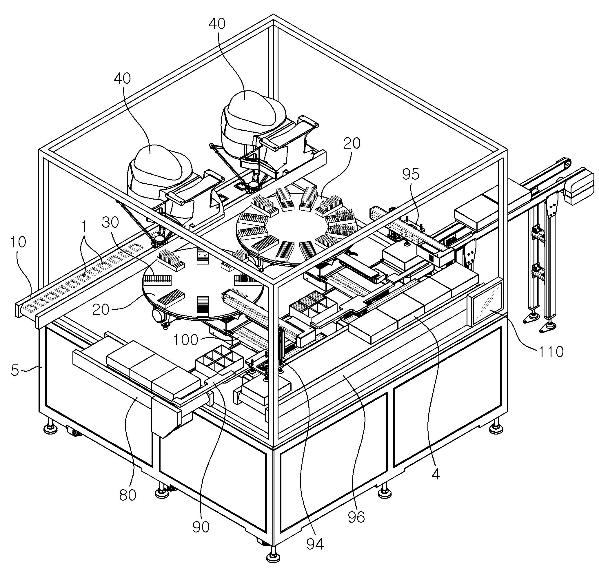 요약 : 본 발명은 파우치(1)를 전방으로 이송하는 이송컨베이어(10); 상기 이송컨베이어(10)의 측방에 위치되며, 면상에는 반경방향으로 연장된 복수개의 개구부(21)가 원주방향을 따라 이격 형성된 턴테이블(20); 상기 턴테이블(20)의 상면에 고정되며, 상하로 관통된 다수의 슬롯(31)이 수평 배치되고 이 다수의 슬롯(31)이 상기 턴테이블(20)의 각 개구부(21)와 연통되는 복수개의 슬롯매거진(30); 상기 이송컨베이어(10)의 측방에 위치되며, 이송되는 파우치(1)를 픽업하여 상기 슬롯매거진(30)의 각 슬롯(31)에 삽입하는 픽업수단(40); 상기 턴테이블(20)의 개구부(21)를 개폐하며, 이 개구부(21)를 개방시켜 슬롯매거진(30)의 슬롯(31)에 수납된 파우치(1)를 낙하시키는 개폐판(50); 상기 턴테이블(20)의 하측에 구비되며, 상기 슬롯매거진(30)에서 낙하되는 파우치(1)가 박스(2)의 각 수납홈(3)에 삽입되도록 가이드해주는 수납가이더(60); 상기 수납가이더(60)의 출구(64)의 하측으로 박스(2)를 공급하는 박스공급수단; 및 상기 턴테이블(20), 픽업수단(40), 개폐판(50) 및 박스공급수단의 작동을 제어하는 컨트롤러(110);를 포함하여 구성된 것을 특징으로 하는 파우치 자동포장기이다.