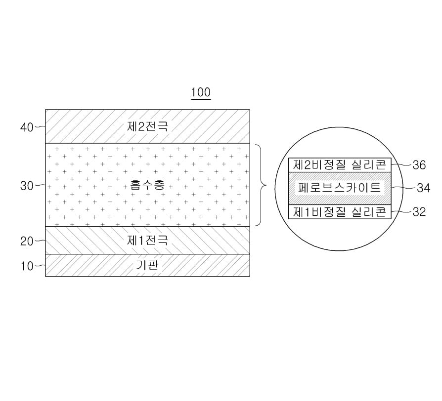 는, 제 1 전극, 제 1 비정질 실리콘 흡수층, 페로브스카이트 흡수층, 제 2 비정질 실리콘 흡수층 및 제 2 전극을