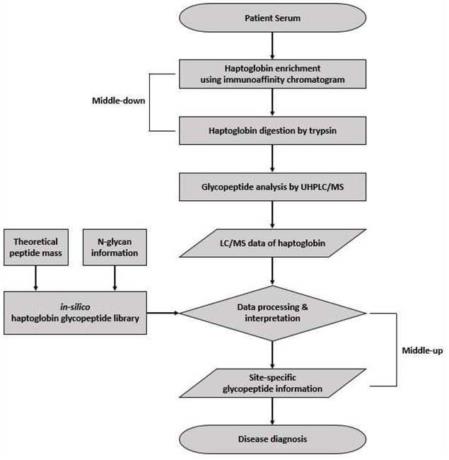 대표청구항 : a) 다중 당쇄화 자리를 가진 표적 당단백질에 트립신을 처리하였을 때 예상 가능한 당펩타이드 아미노산 서열 질량값과 당펩타이드의 예상 가능한 당쇄 질량값을 조합하여 인-실리코 당펩타이드 라이브러리를 생성하는 단계;b) 정상인 대조군과 특정 질병 환자군의 시료로부터 표적 당단백질을 분리 및 정제하는 단계;c) 정제된 표적 당단백질을 변성 및 알킬화하는 단계;d) 변성 및 알킬화된 당단백질에 트립신을 처리하여 당펩타이드를 제조하는 단계;e) 별도의 당펩타이드 분리 및 정제 단계 없이 당펩타이드를 UHPLC 질량분석기에 주입하여 질량분석하는 단계;f) 당펩타이드 질량분석 결과, 정상인 대조군과 특정 질병 환자군 간 유의한 차이를 나타내는 피크를 상기 a)에서 생성된 인-실리코 당펩타이드 라이브러리와 비교하여 상기 피크의 당펩타이드와 당쇄 조성을 확인하는 단계;g) 확인한 당펩타이드와 당쇄 조성 중 t-검정을 통한 p-값이 0.0001 미만이고 빈도가 90% 이상인 당펩타이드와 당쇄 조성을 선별하는 단계; 및h) 선별된 당펩타이드와 당쇄 조성에 대하여 ROC(Receiver Operation Characteristic) 분석을 수행하여 바이오마커를 발굴하는 단계;를 포함하는 다중 당쇄화 자리를 가진 표적 단백질에 대한 글라이코프로테옴 분석을 통하여 질병 진단을 위한 정보를 제공하는 방법.