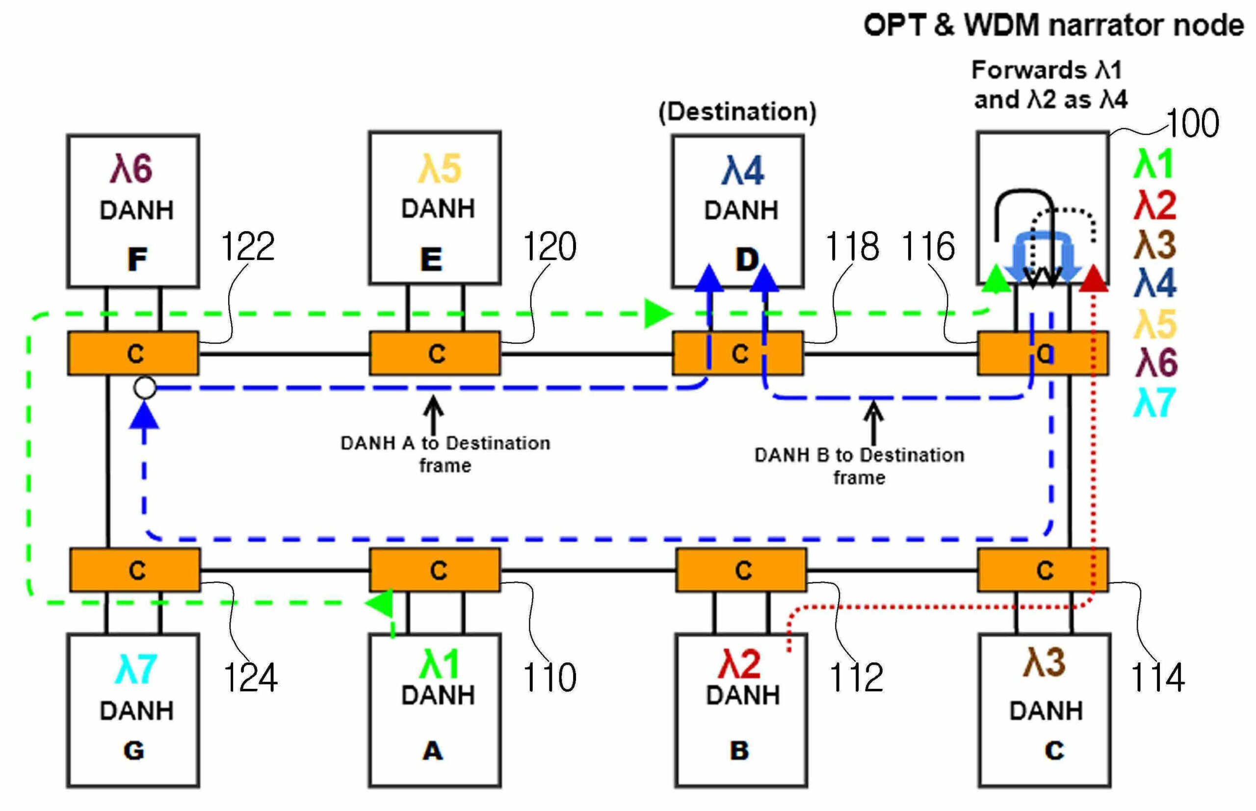 요약 : 프레임 충돌을 방지할 수 있는 광 네트워크 및 이에 있어서 통신 방법이 개시된다. 상기 광 네트워크는 복수의 광 노드들 및 파장 변환 노드를 포함한다. 여기서, 상기 광 노드들 중 적어도 하나는 다른 파장을 사용하며, 상기 파장 변환 노드는 상기 광 노드들 중 특정 광 노드로부터 광 신호가 수신되면 상기 수신된 광 신호의 파장을 목적지 노드의 파장으로 변환하고 상기 변환된 파장을 가지는 광 신호를 상기 목적지 노드로 포워딩한다.