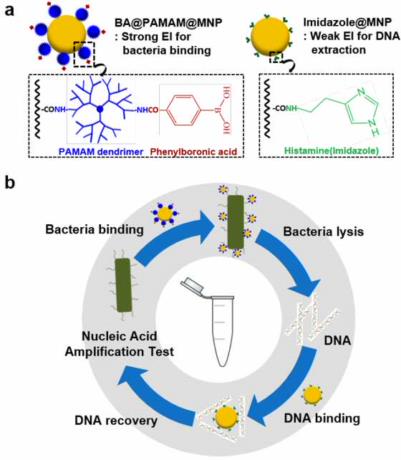 대표청구항 : 1) 하기 화학식 1로 표시되는 제1 자성나노입자를 제조하는 단계;2) 하기 화학식 2로 표시되는 제2 자성나노입자를 제조하는 단계;3) 상기 제1 자성나노입자로 분리된 샘플을 처리하여 병원체를 제거하는 단계;4) 상기 샘플로부터 상기 병원체가 부착된 제1 자성나노입자를 분리하는 단계;5) 상기 분리된 병원체를 용해시켜 DNA를 추출하는 단계;6) 상기 추출된 DNA에 상기 제2 자성나노입자를 투입하는 단계;7) 상기 제2 자성나노입자가 DNA에 부착되는 단계; 및8) 상기 DNA가 부착된 제2 자성나노입자로부터 DNA를 용출시키는 단계;를 포함하고, 1) 내지 8) 단계는 단일 튜브에서 분석되는 것을 특징으로 하는 핵산 증폭 분석용 시료 전처리 방법[화학식 1][이미지]{상기 화학식 1에서, [이미지]은 자성나노입자이며, [이미지]은 폴리아미도아민(polyamidoamine; PAMAM)이다.}[화학식 2][이미지]{상기 화학식 2에서, [이미지]은 자성나노입자이다.}