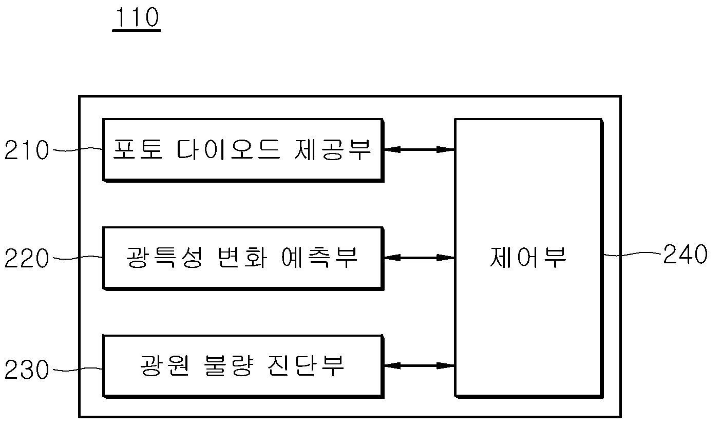 본 발명의 일 실시예에 따른 OLED 시험 방법은 시험 대상인 광원의 파장대에 대응되는 제1 포토 다이오드, 상기 제1 포토 다이오드와 다른 파장대를 가지는 제2 포토 다이오드 및 제3 포토 다이오드를 준비하는 단계; 상기 제1 내지 제3 포토 다이오드를 이용하여 상기 광원의 조도 변화 및 파장대 변화를 예측하는 단계; 및 상기 조도 변화 및 파장대 변화의 예측 결과에 기초하여 상기 광원의 불량 여부를 테스트하는 단계를 포함한다.